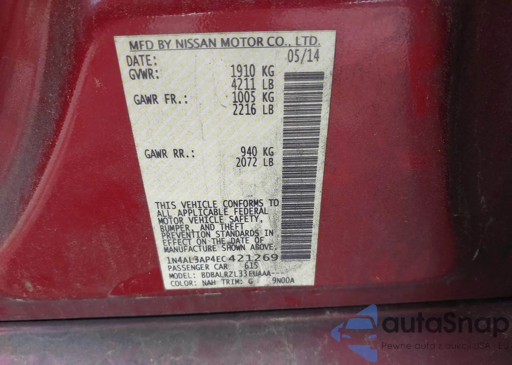 LOT: 42183754 VIN: 1N4AL3AP4EC421269