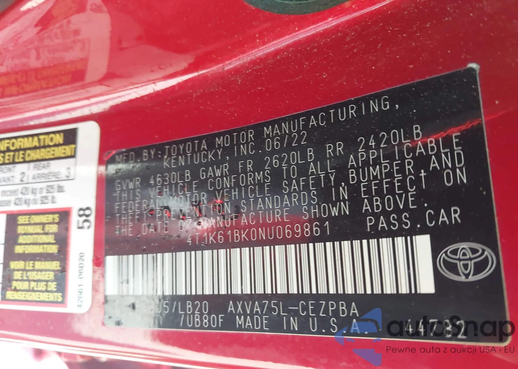 • VIN 4T1K61BK0NU069861