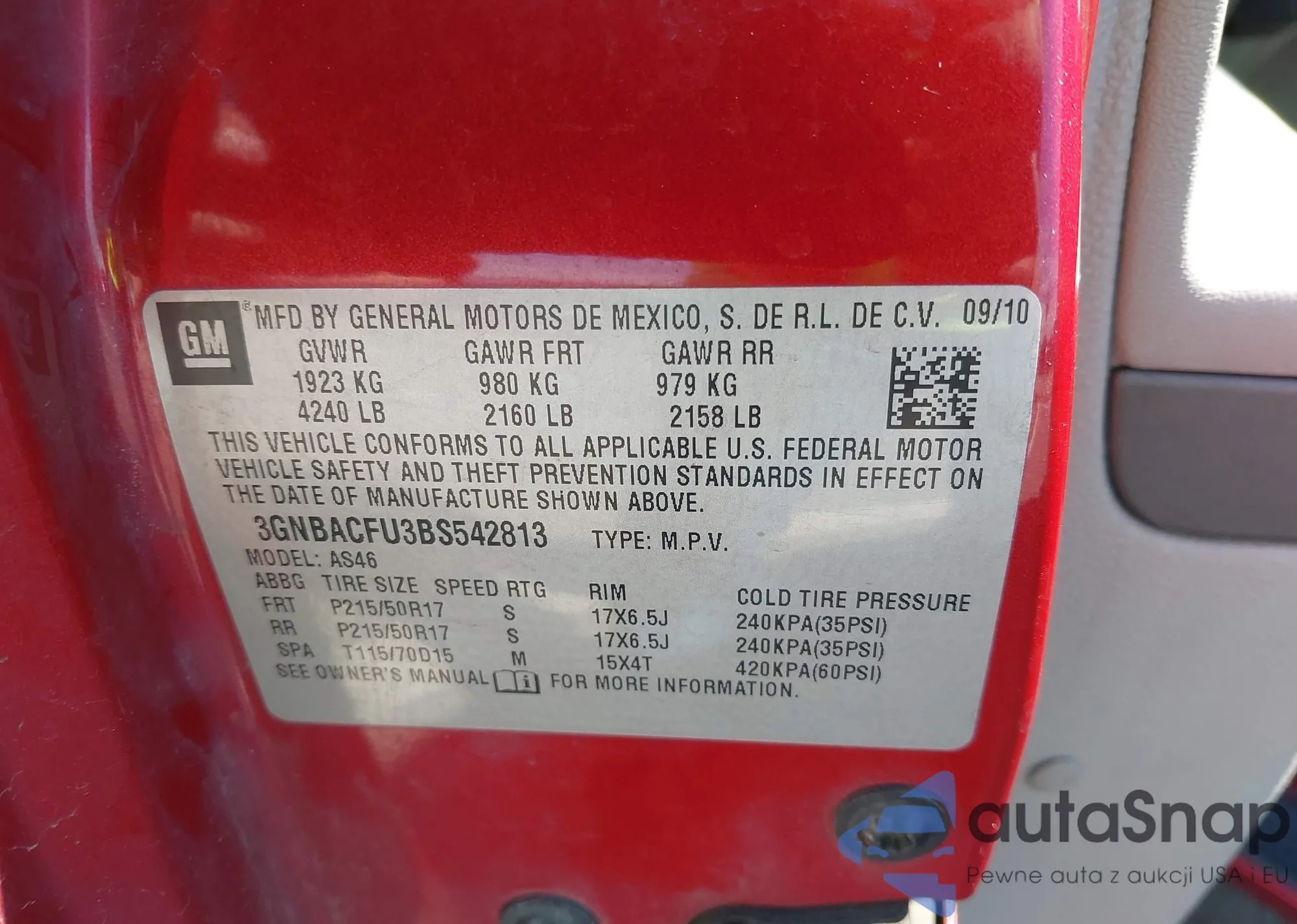 LOT: 42200157 VIN: 3GNBACFU3BS542813