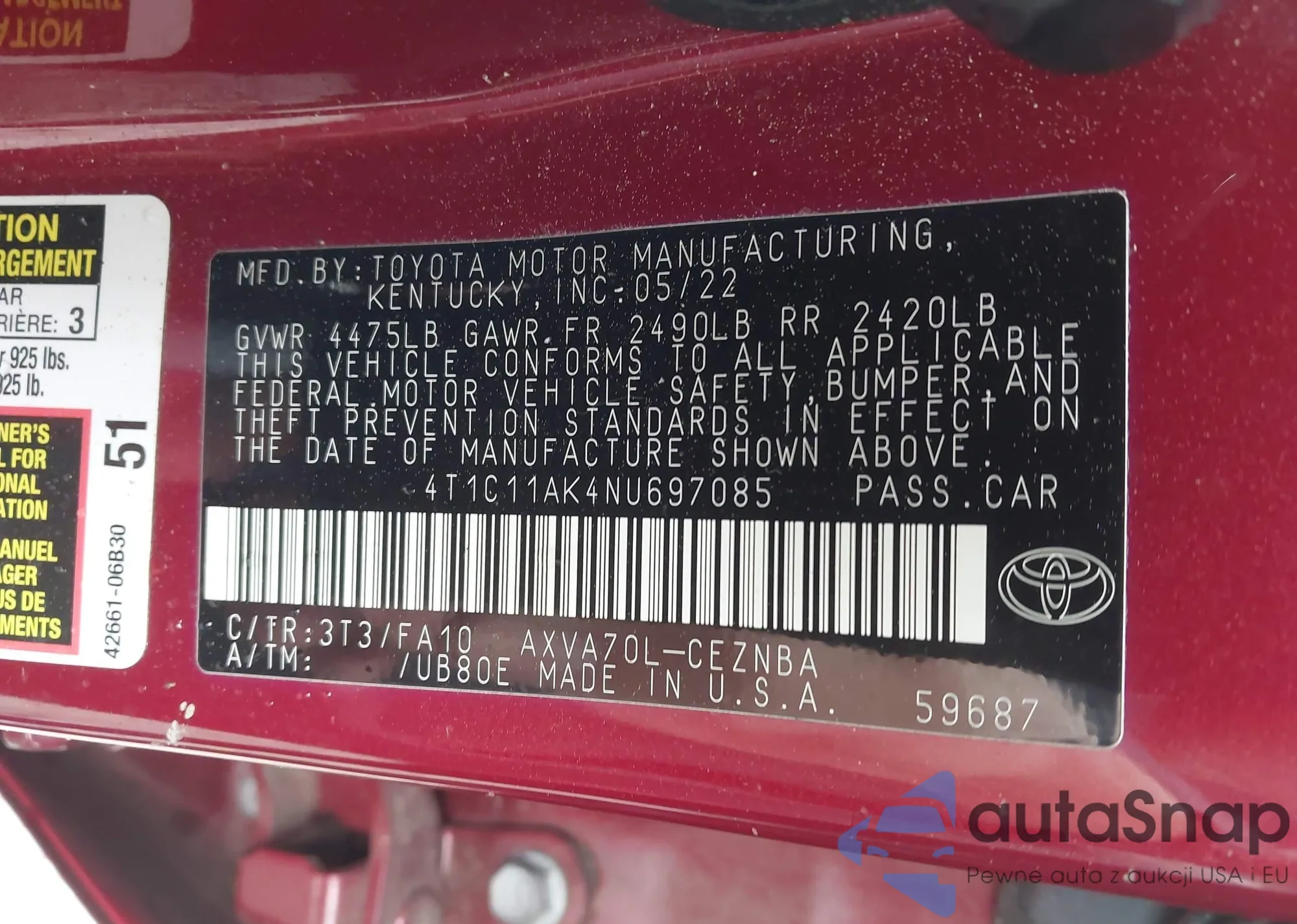 LOT: 42207726 VIN: 4T1C11AK4NU697085
