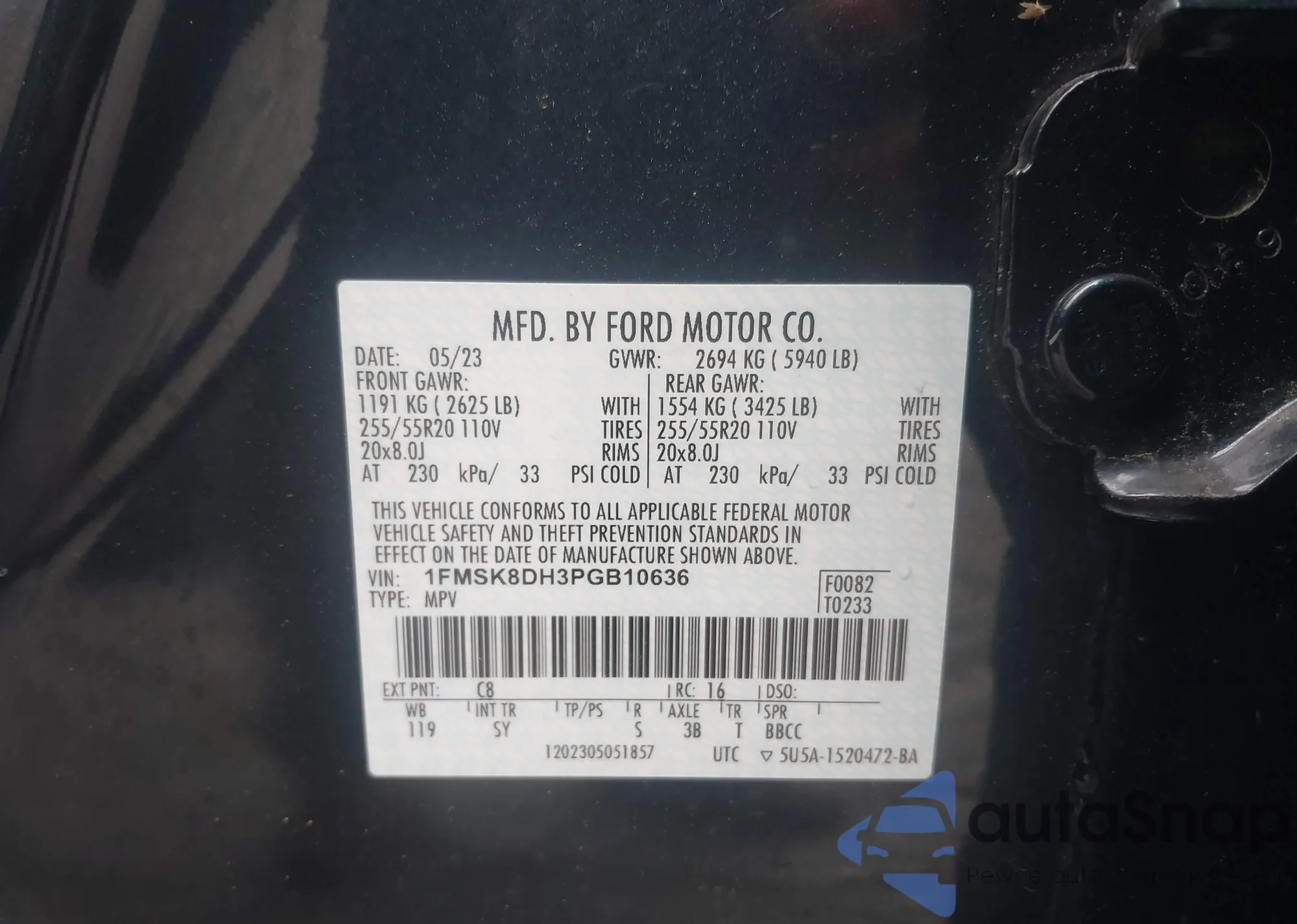 LOT: 42189804 VIN: 1FMSK8DH3PGB10636