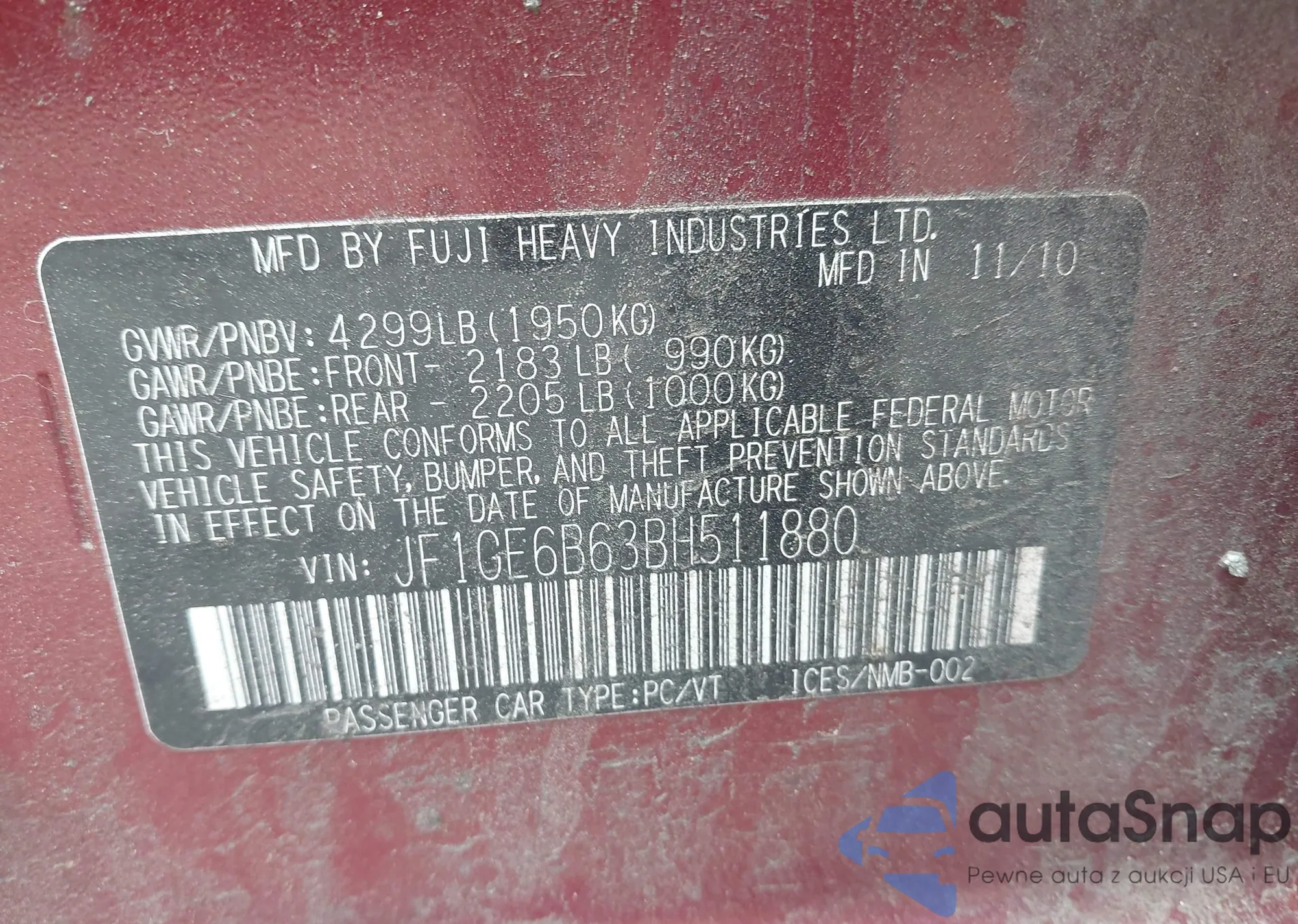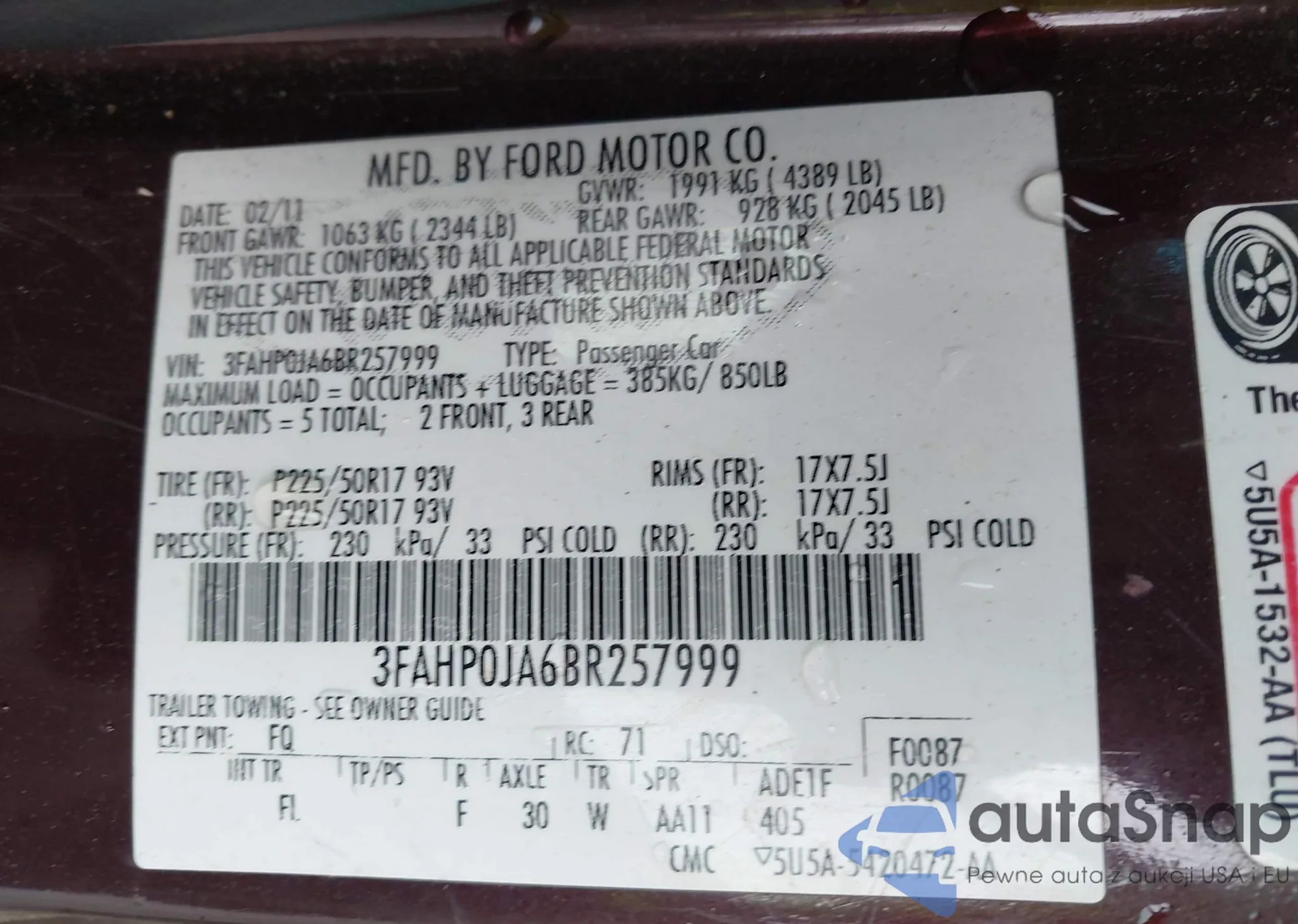 • VIN 3FAHP0JA6BR257999