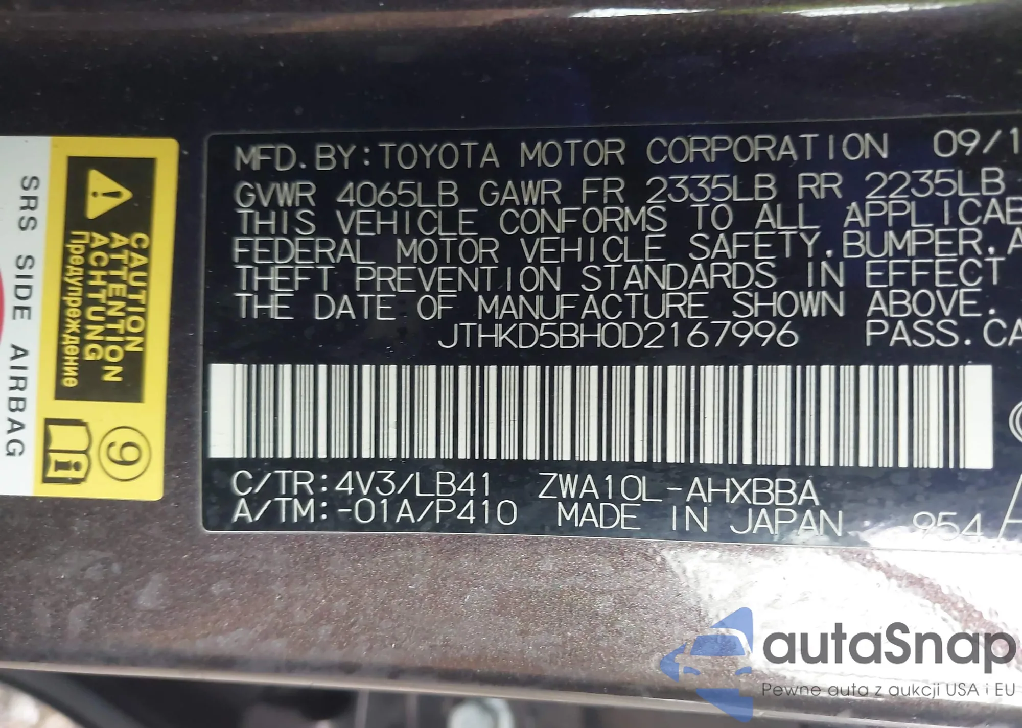 LOT: 42213439 VIN: JTDKN3DU6A0157669