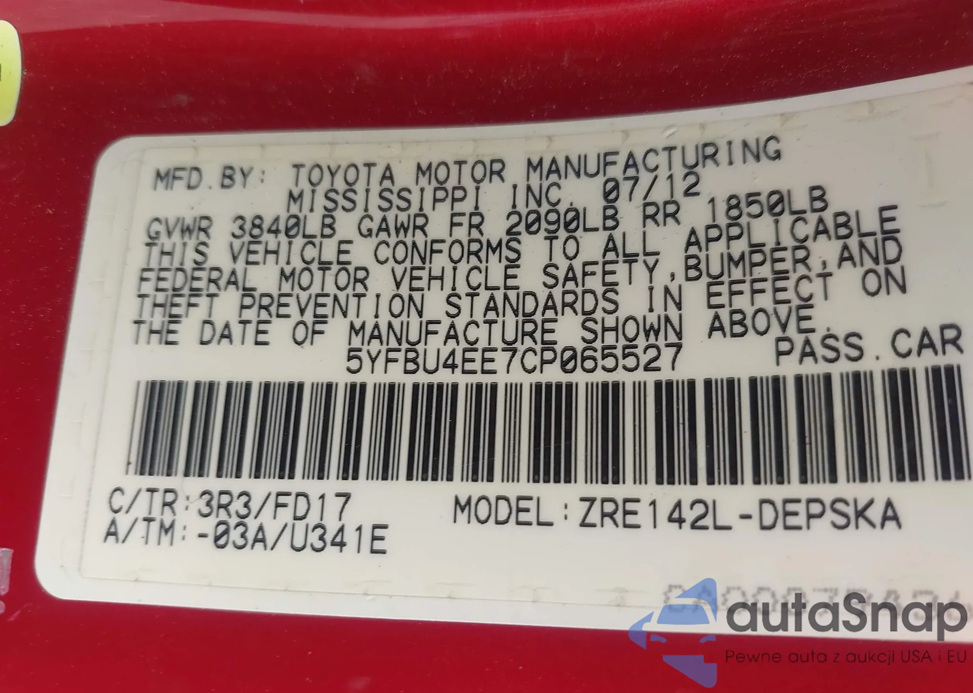 • VIN 5YFBU4EE7CP065527