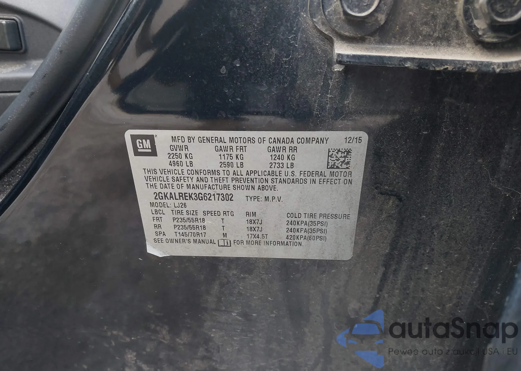 LOT: 42384915 VIN: 2GKALREK3G6217302
