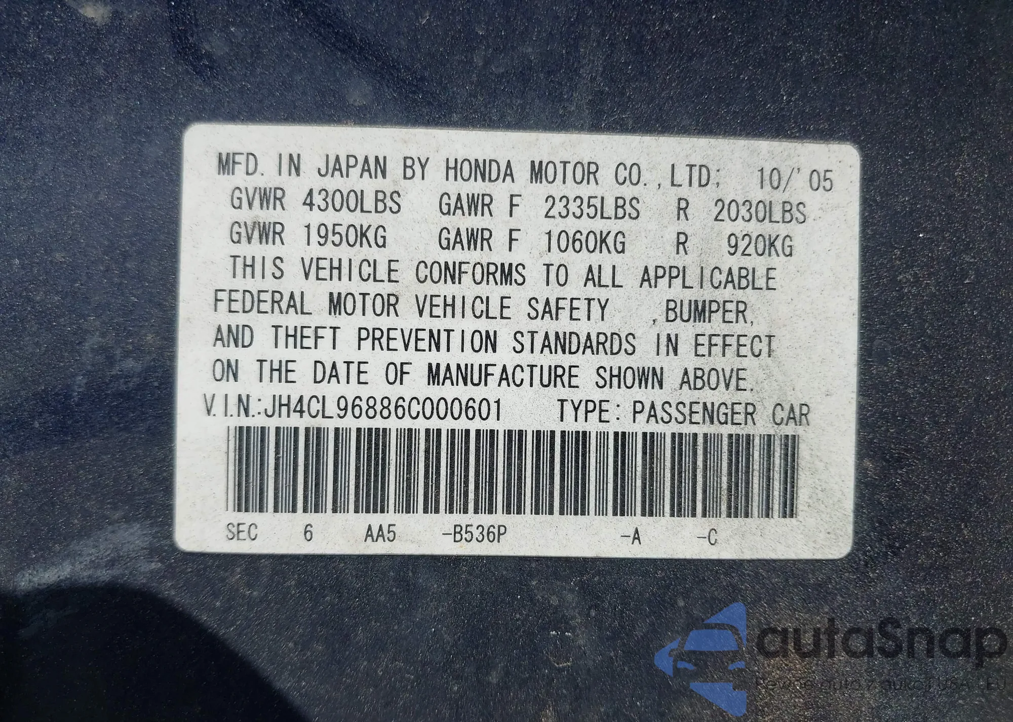 LOT: 42560839 VIN: JH4CL96886C000601