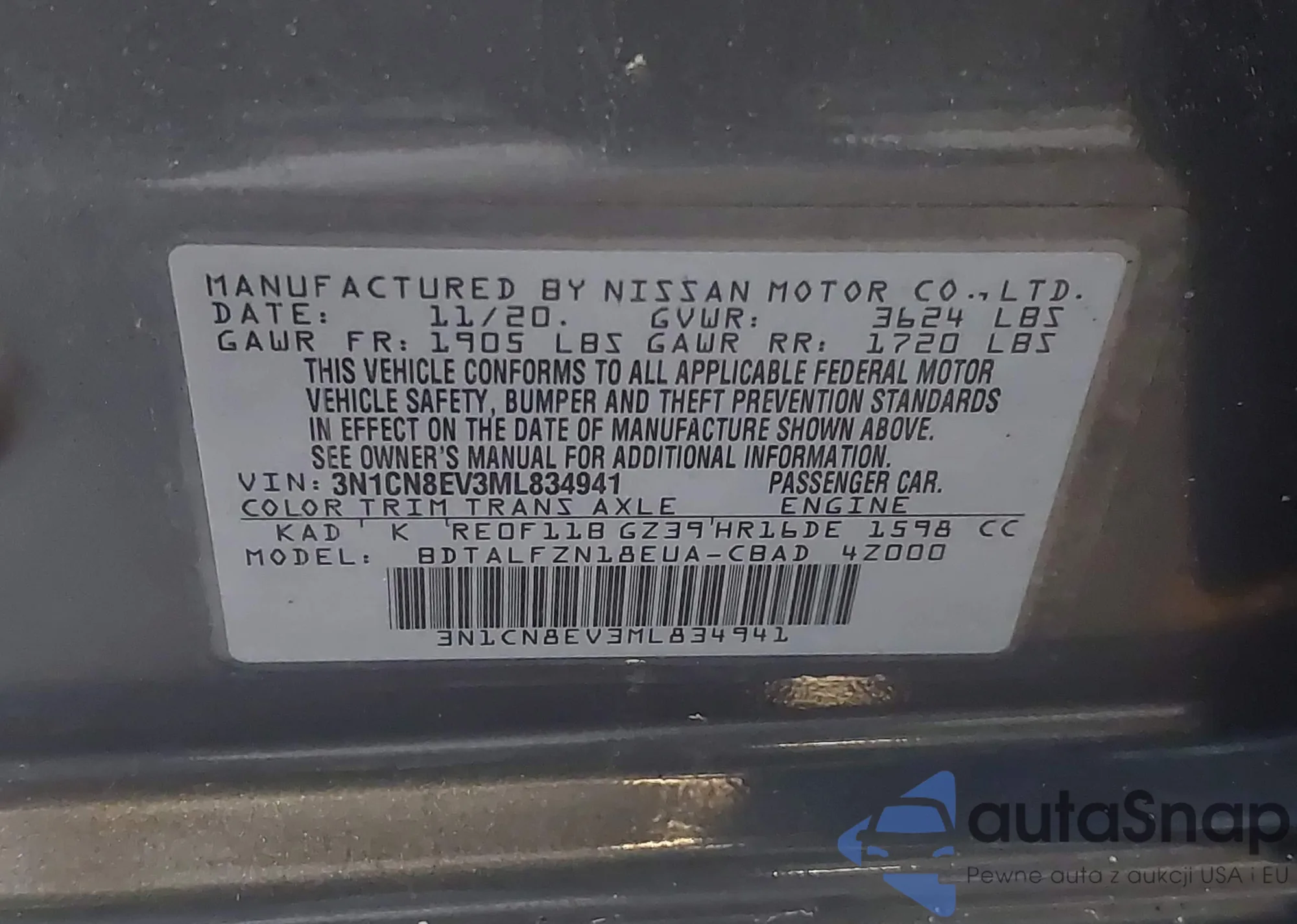 LOT: 42223565 VIN: 3N1CN8EV3ML834941