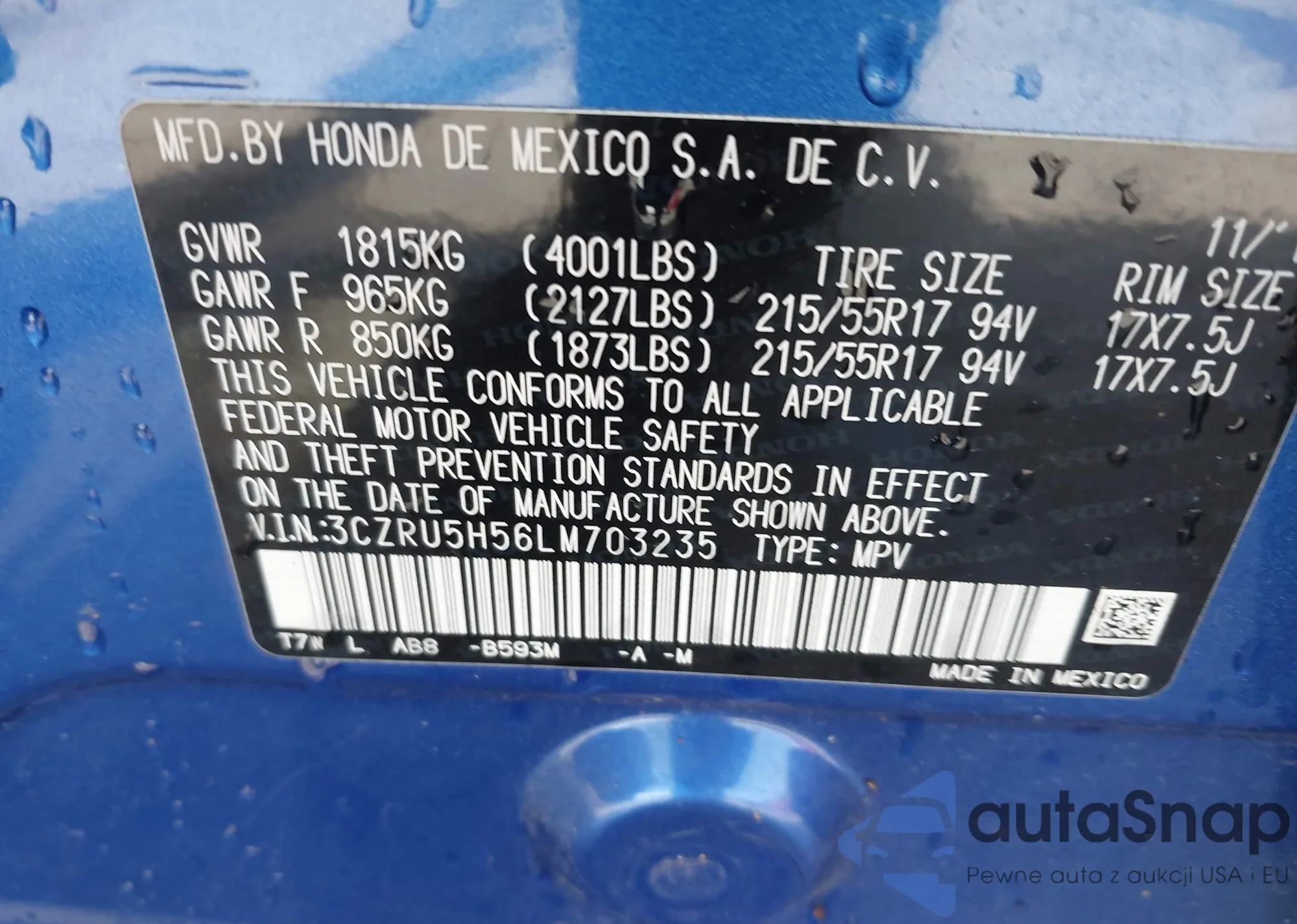 • VIN 2HKRW2H82LH600215