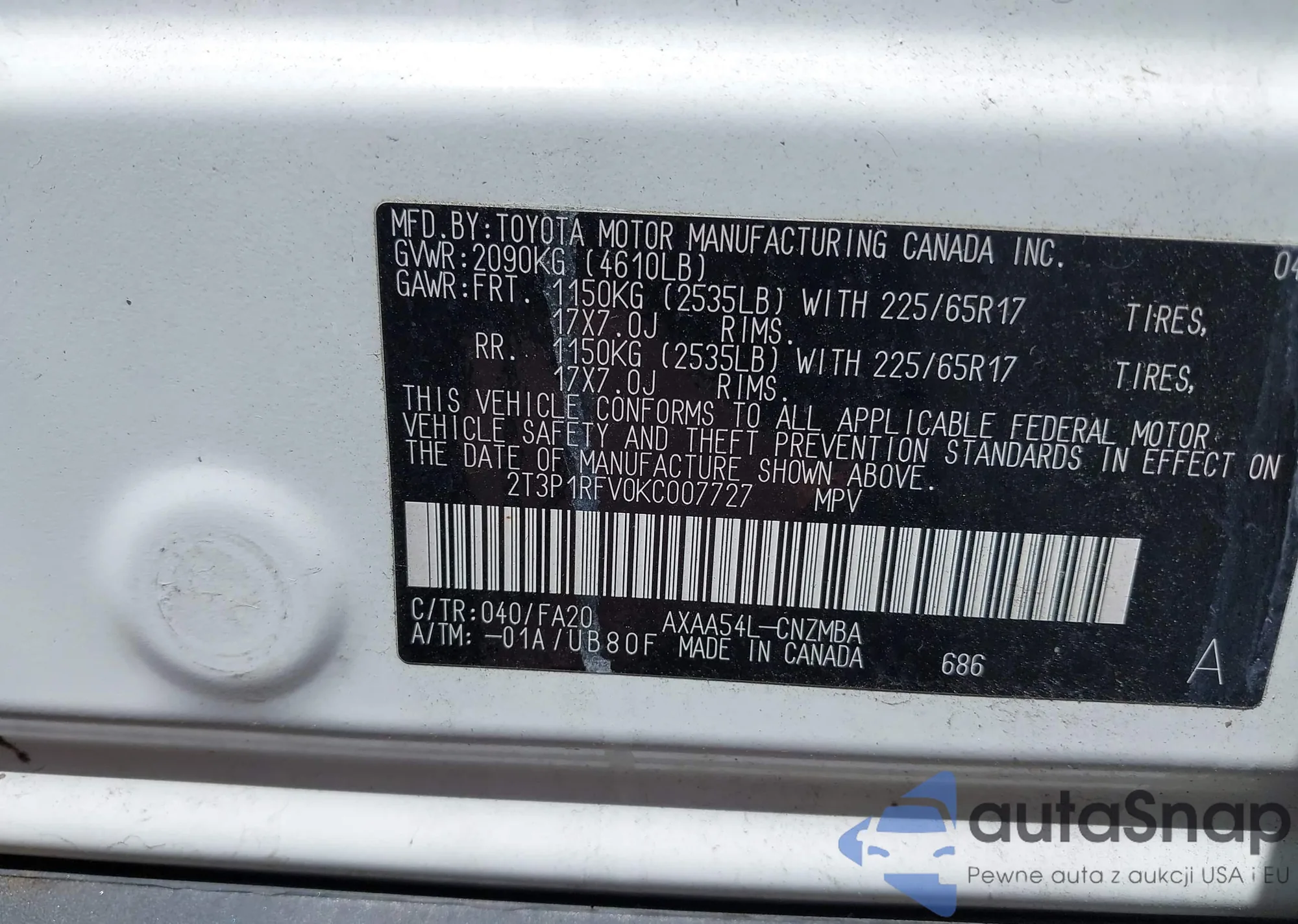 LOT: 42307653 VIN: 2T3P1RFV0KC007727