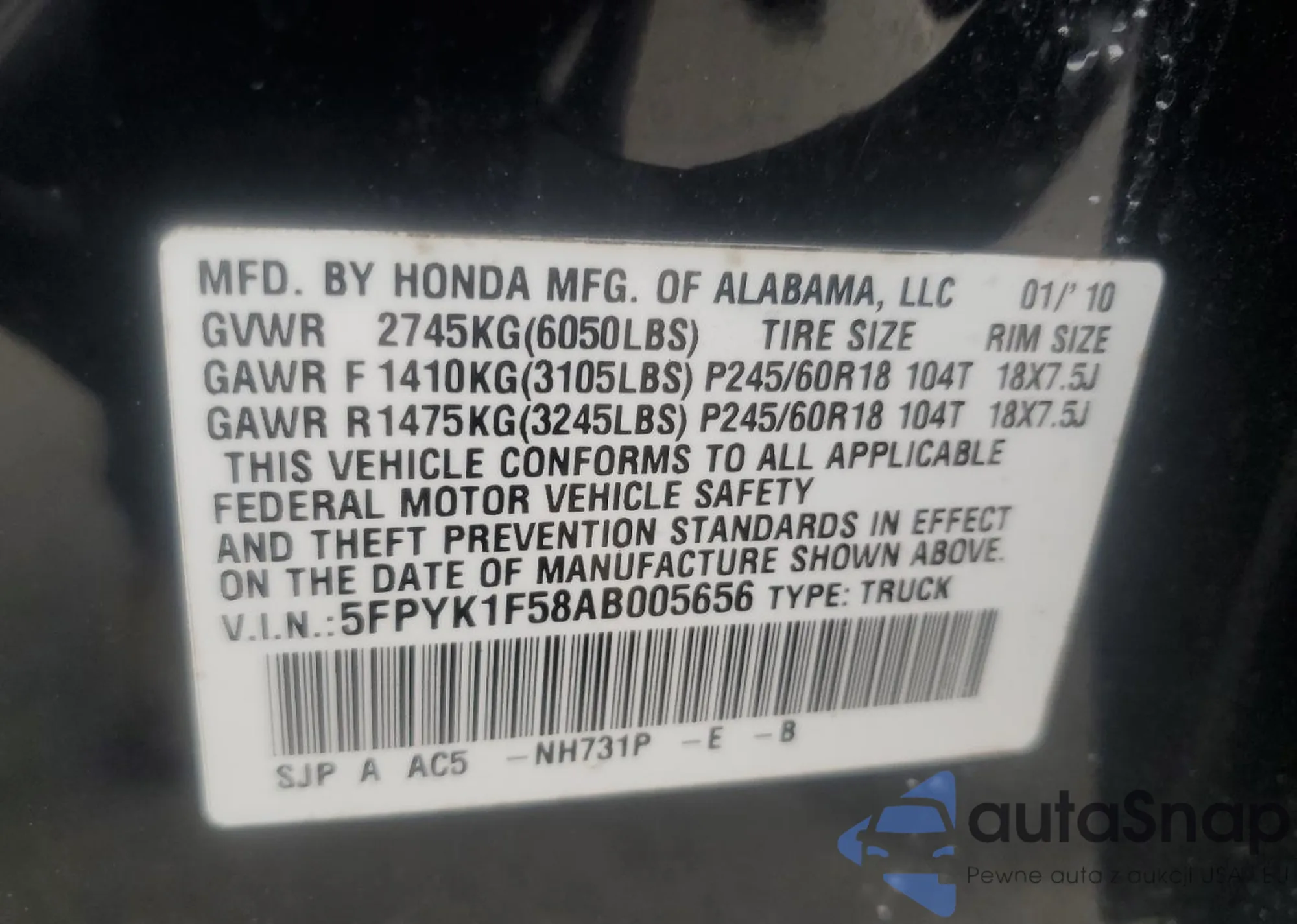 • VIN 5FPYK1F58AB005656