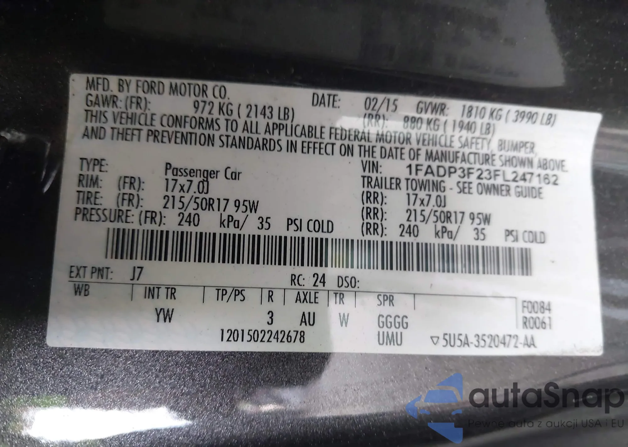 LOT: 42542583 VIN: 1FADP3F23FL247162