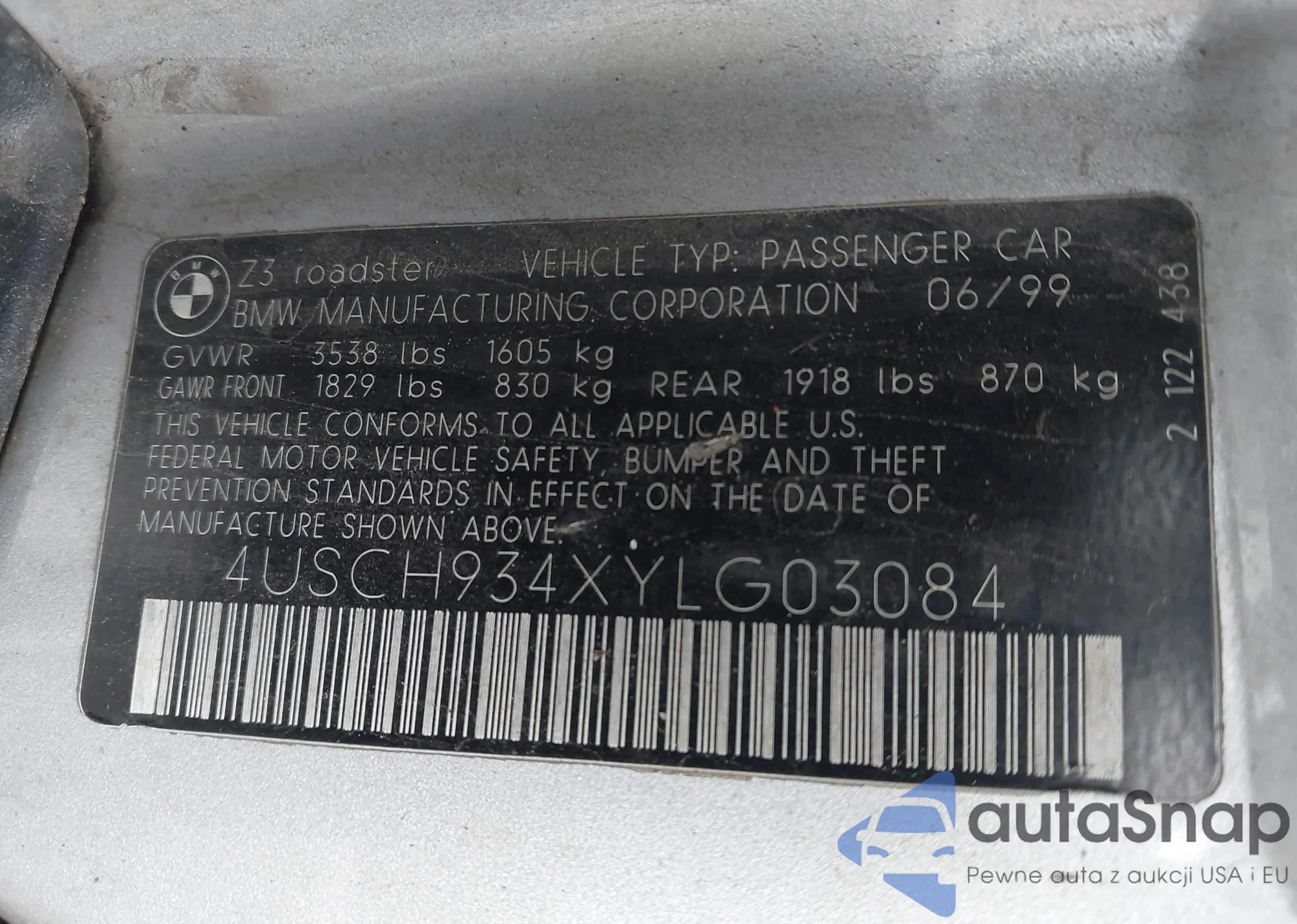 2000 BMW Z3 2.3 из США, поврежденный, VIN 4USCH934XYLG03084