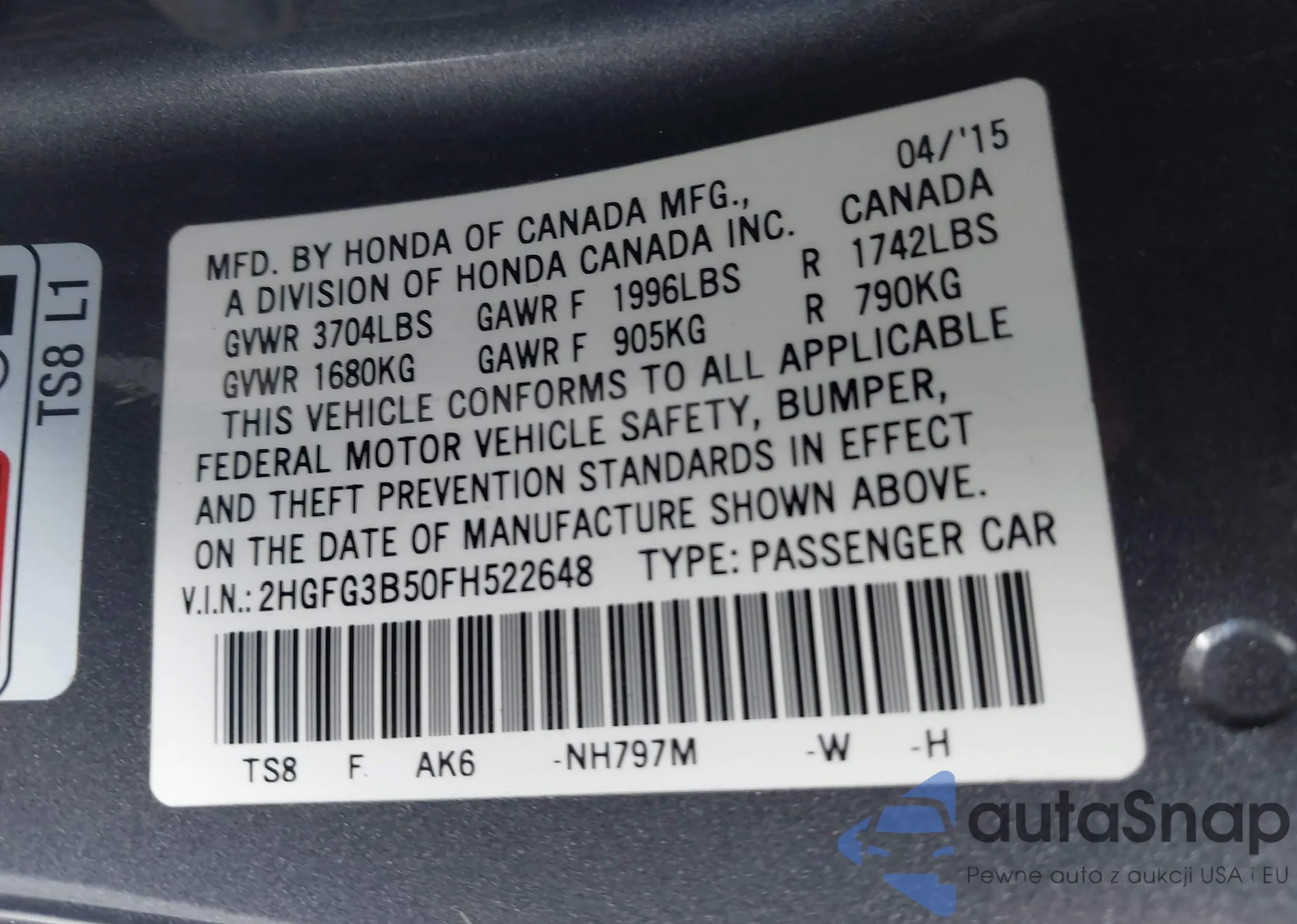 LOT: 42522151 VIN: 2HGFC2F7XJH510792