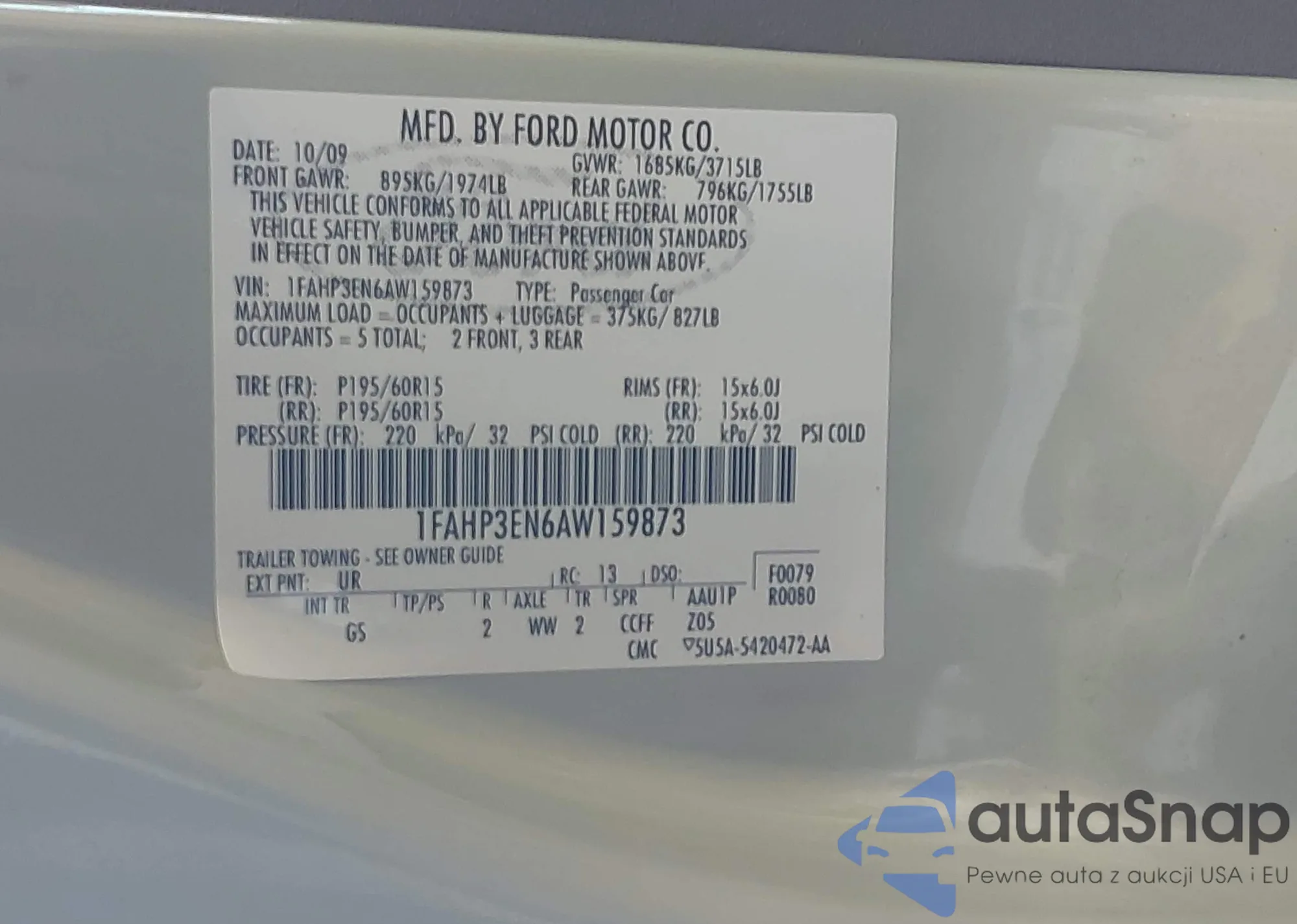 LOT: 42123672 VIN: 1FAHP3EN6AW159873