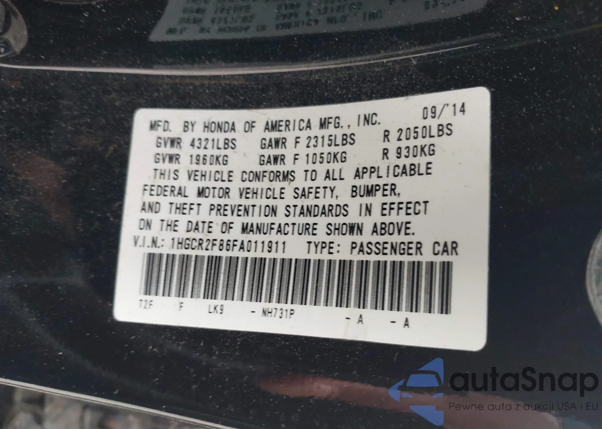 • VIN 1HGCR2F86FA011911