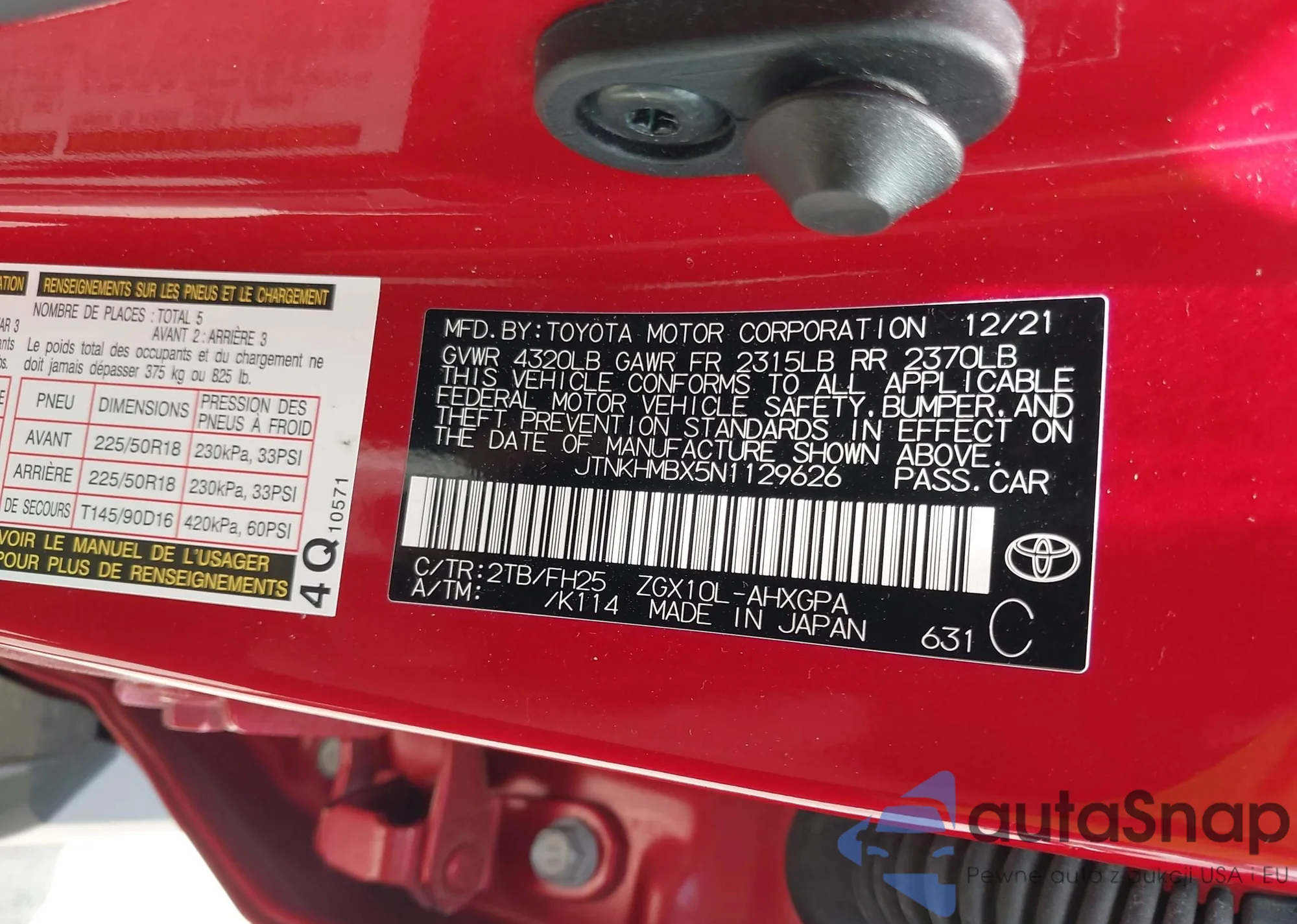 LOT: 42210004 VIN: JTNKHMBX5N1129626