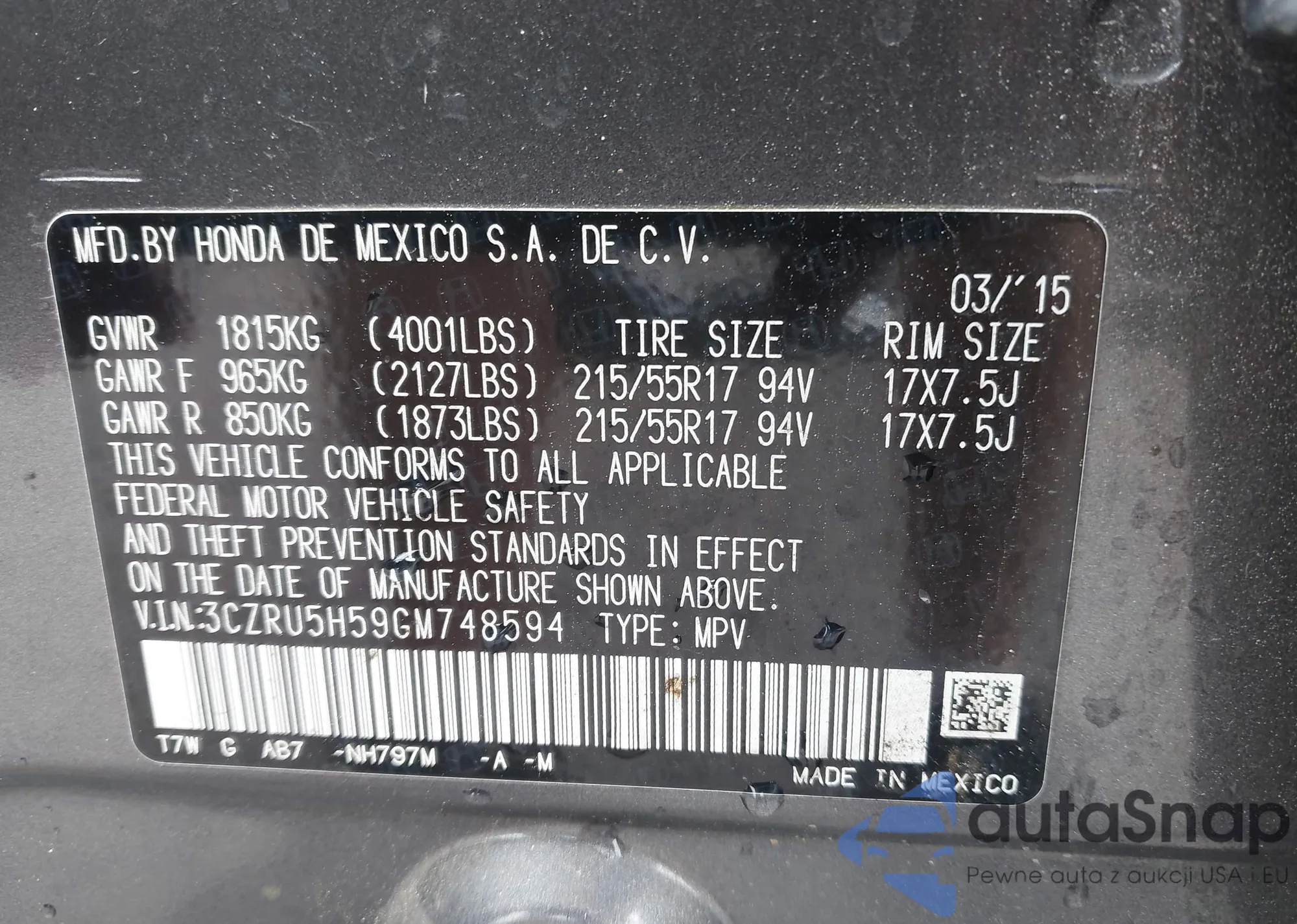 • VIN 3CZRU5H59GM748594