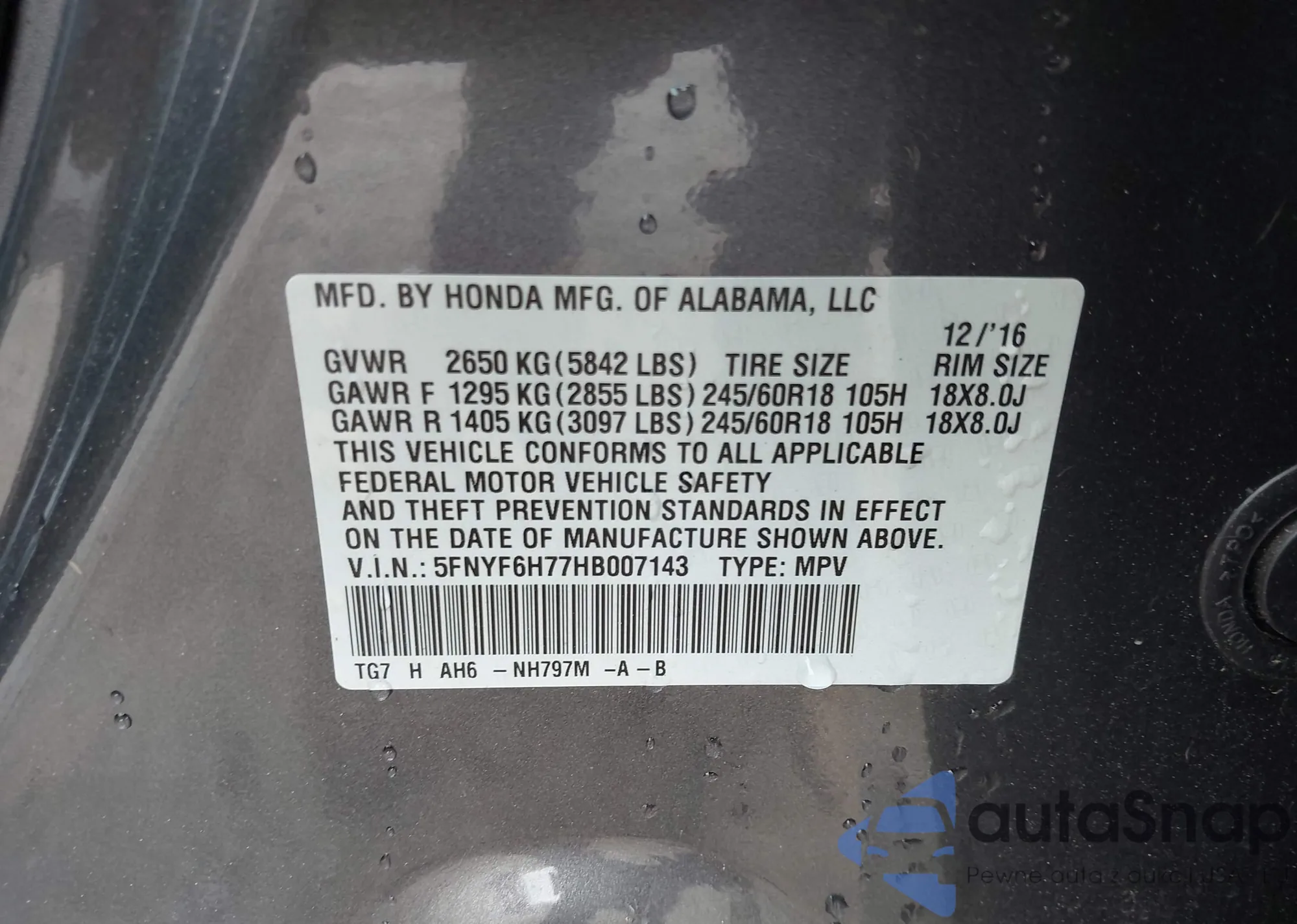 LOT: 42446452 VIN: 5FNYF6H77HB007143