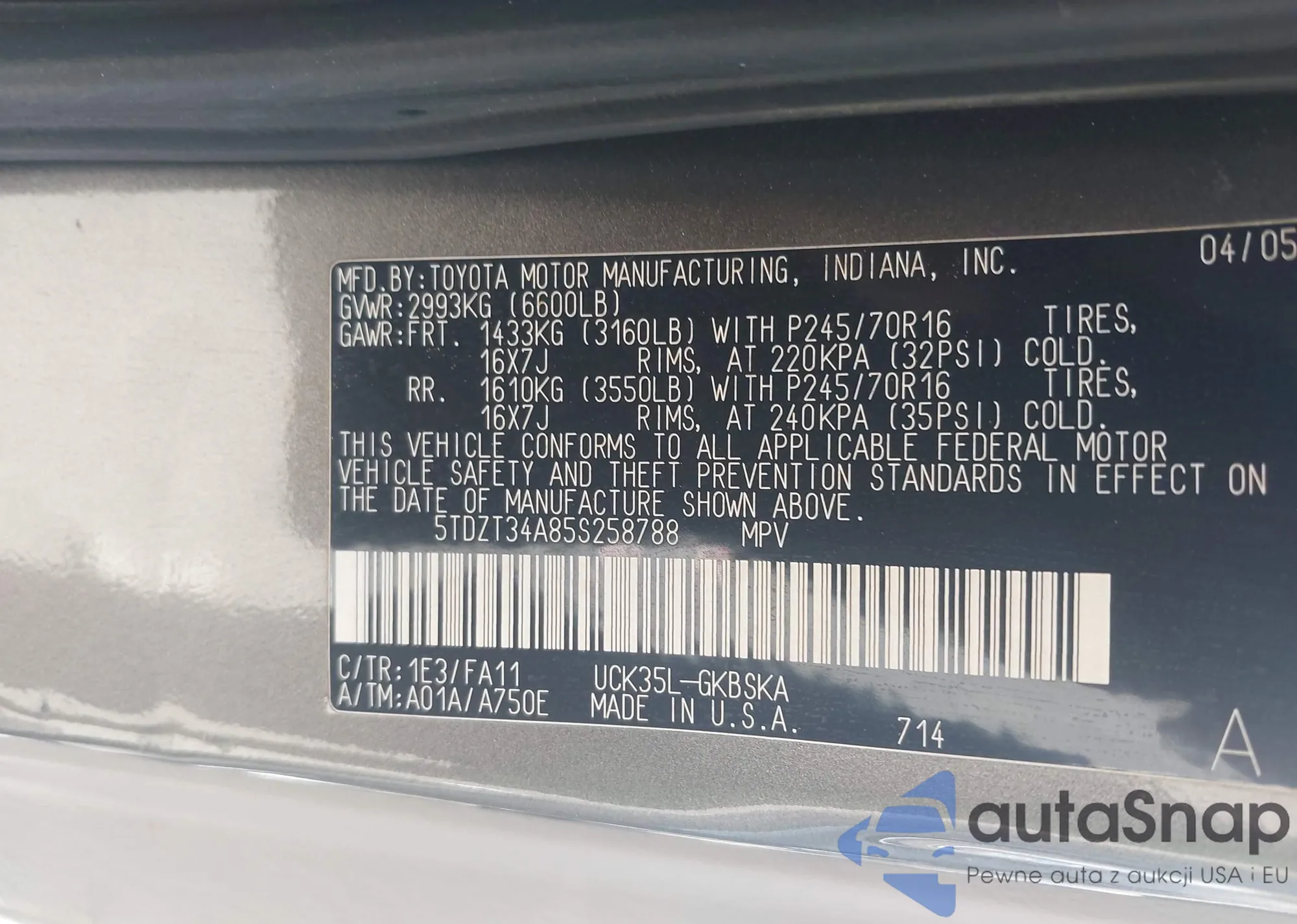 • VIN 5TDZT34A85S258788