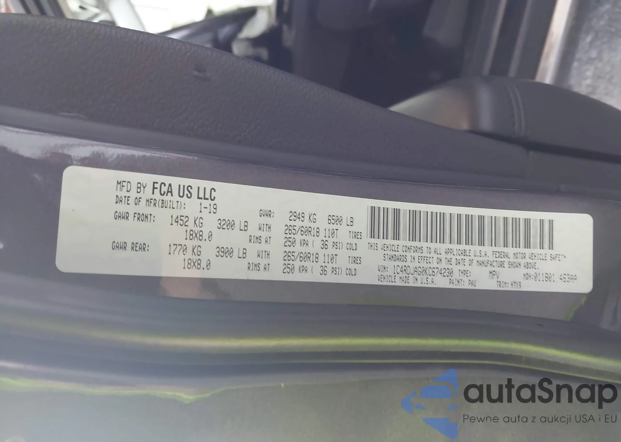 • VIN 1C4RDJAG0KC674230