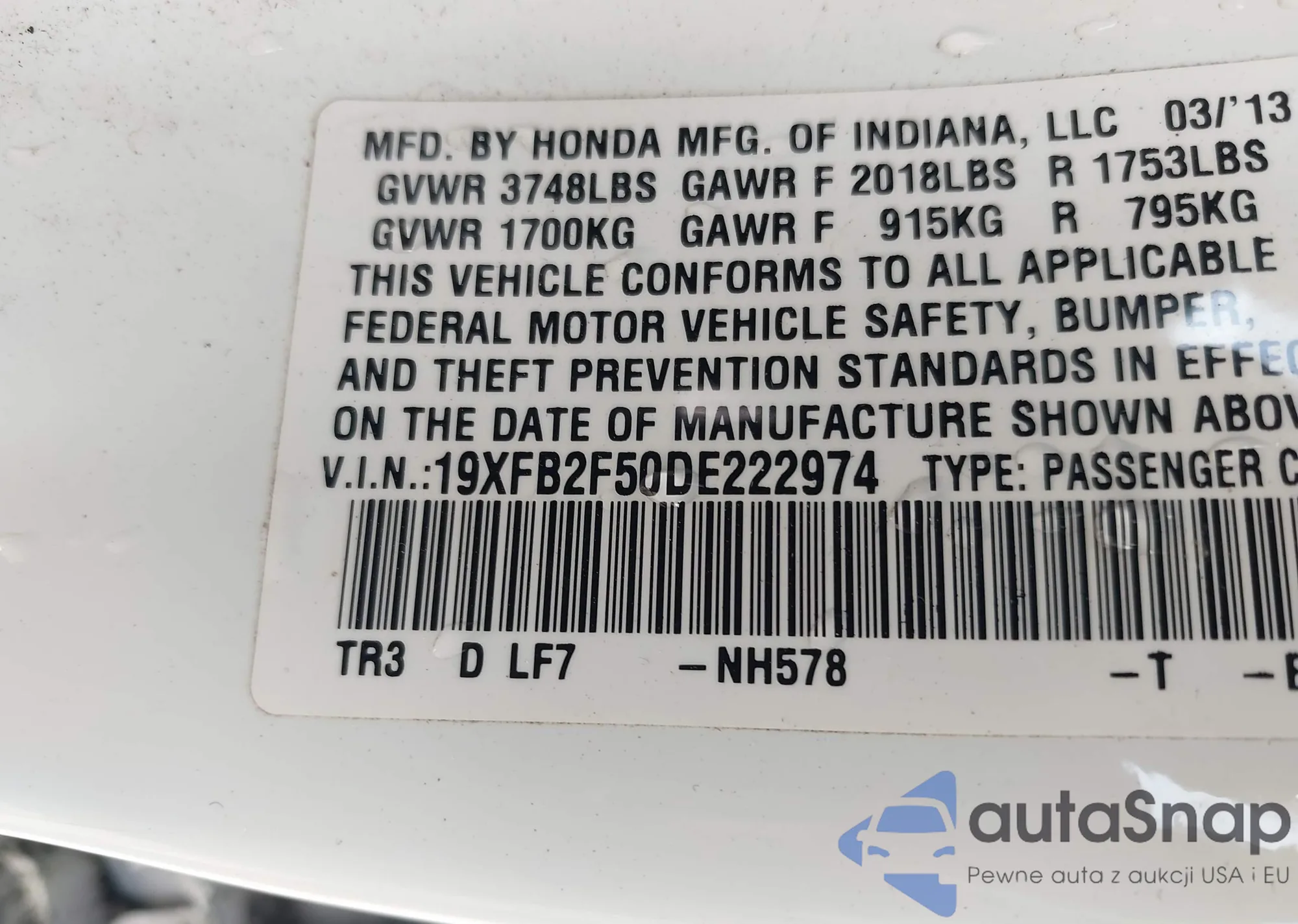 LOT: 42453834 VIN: 19XFB2F50DE222974