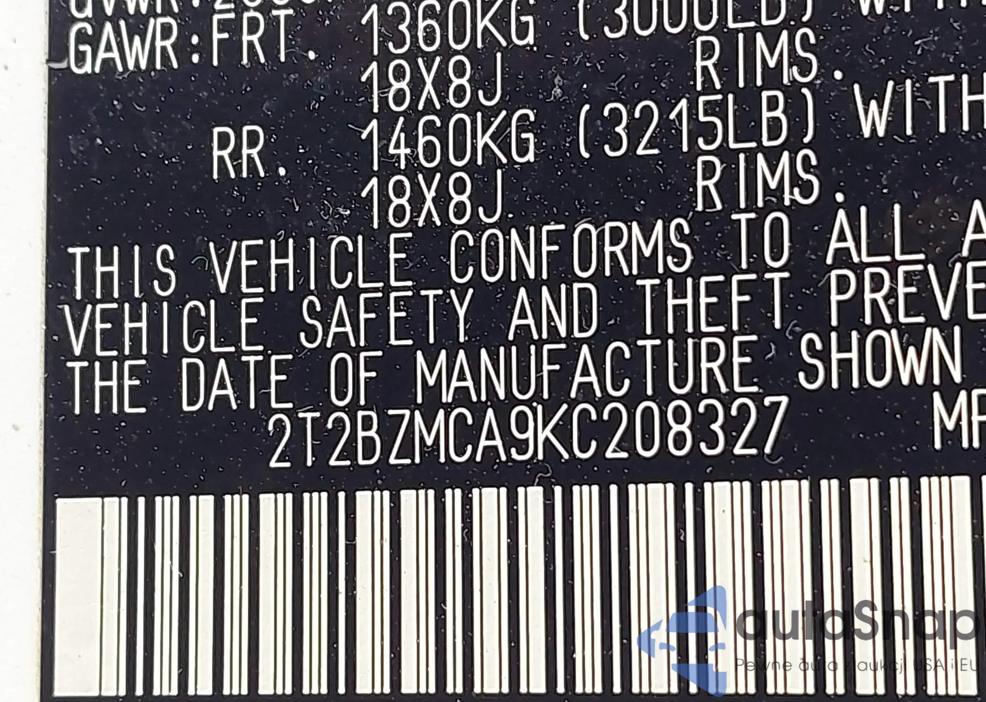 • VIN 2T2BZMCA9KC208327
