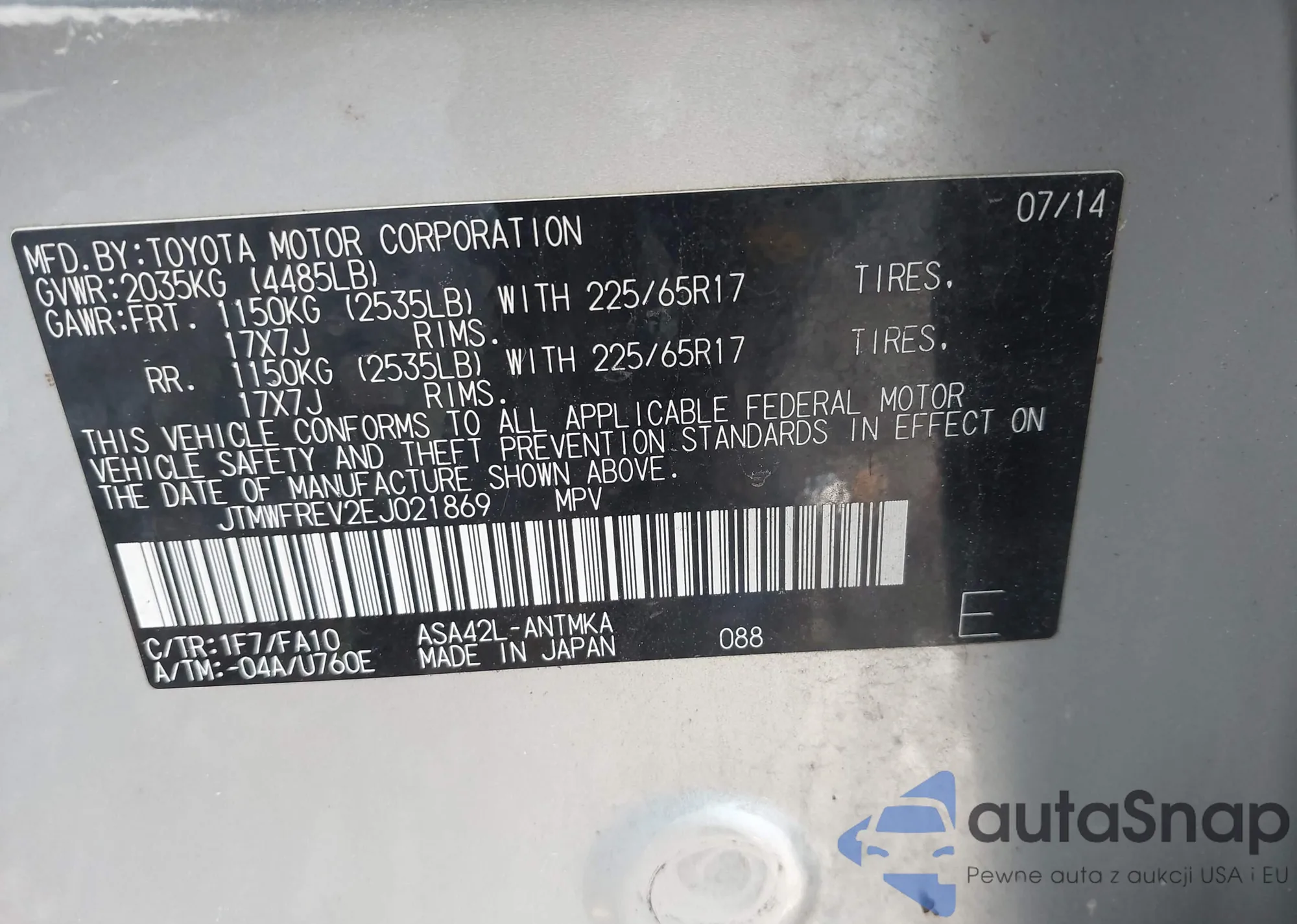 LOT: 41707002 VIN: JTMWFREV2EJ021869