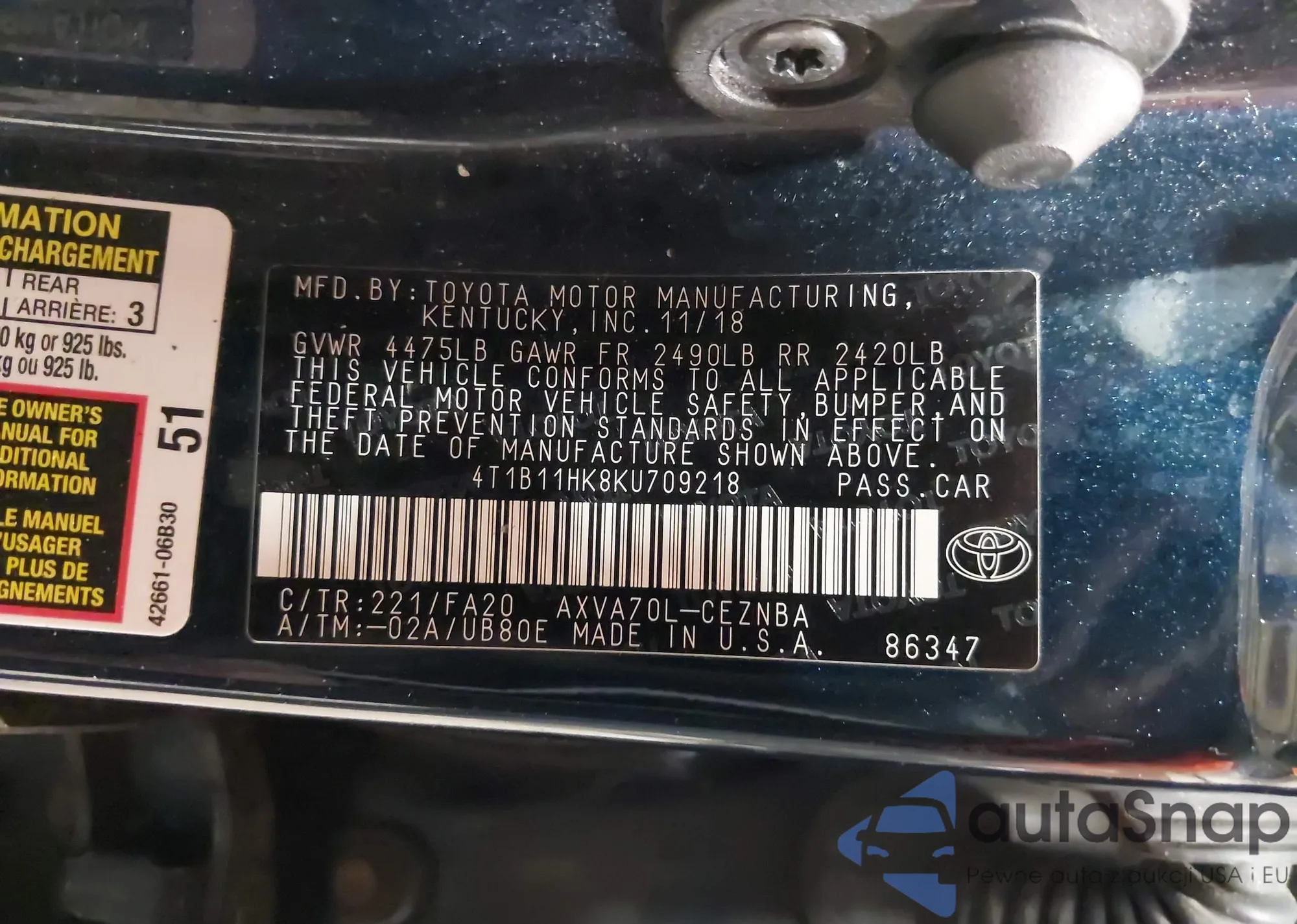 LOT: 42276742 VIN: 4T1B11HK8KU709218