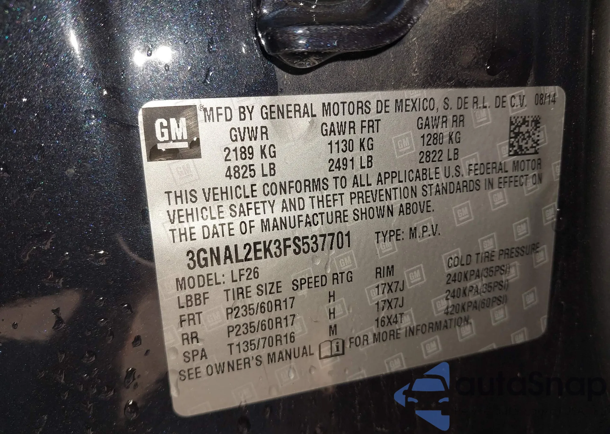 • VIN 3GNAL2EK3FS537701
