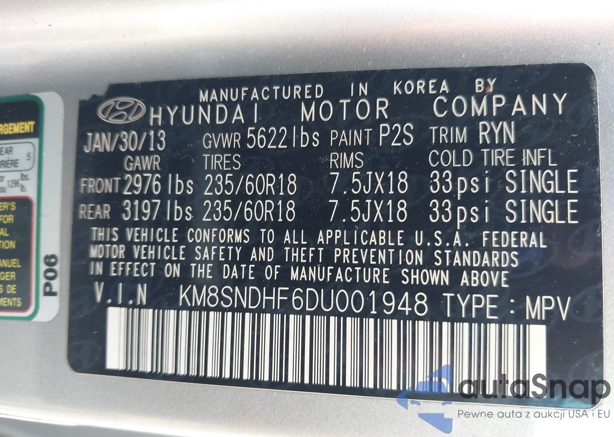 LOT: 42492444 VIN: KM8SNDHF6DU001948