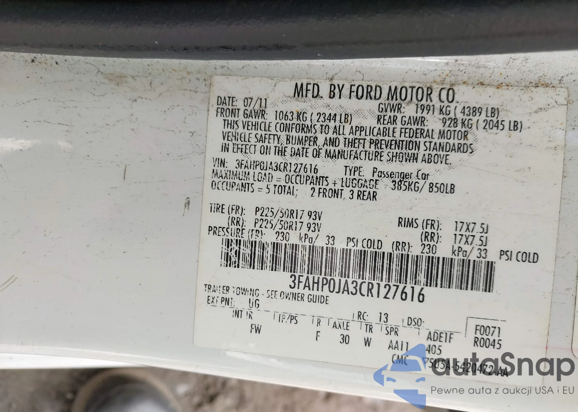 LOT: 42061849 VIN: 3FAHP0JA3CR127616