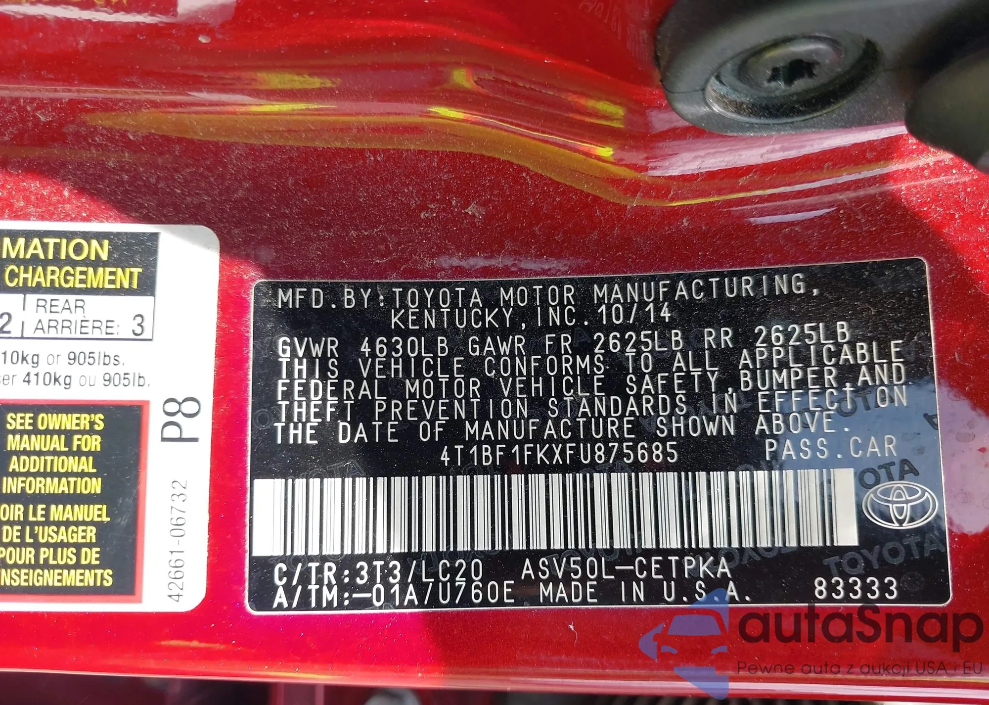 LOT: 42608540 VIN: 4T1BF1FKXF4875685