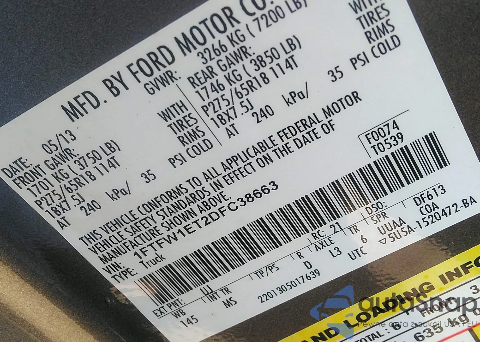 • VIN 1FTFW1ET2DFC38663