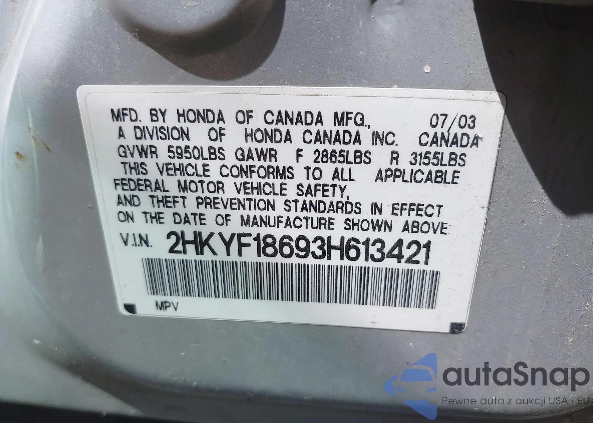 LOT: 42110829 VIN: 2HKYF18693H613421