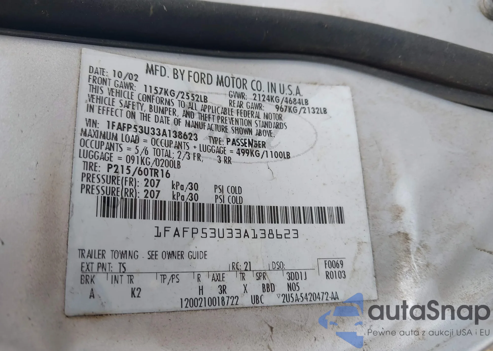 LOT: 42556287 VIN: 1FAFP53U33A138623