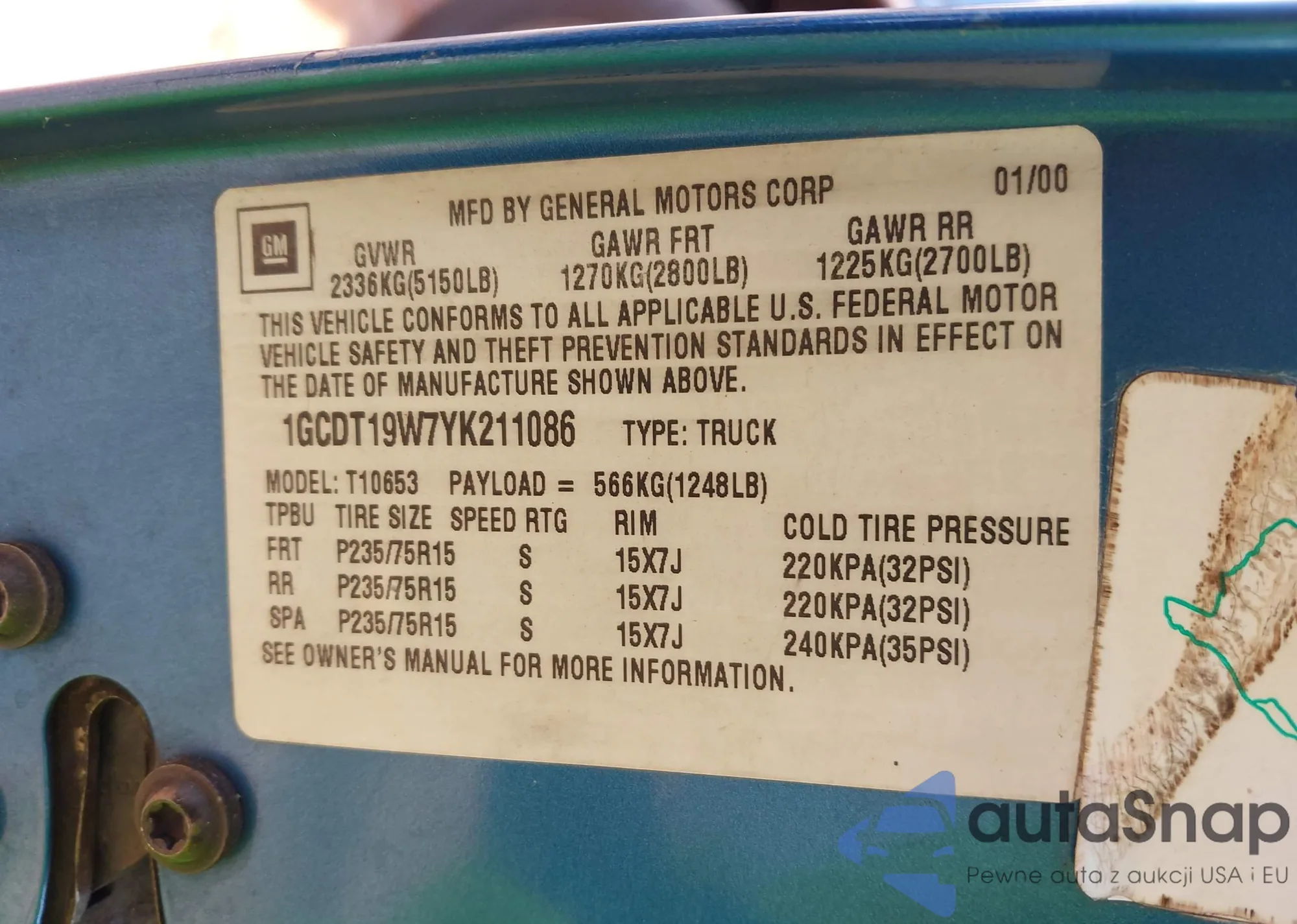 • VIN 1GCDT19W7YK211086