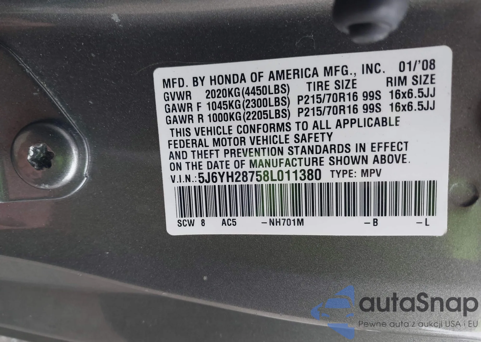 • VIN 5J6YH28758L011380