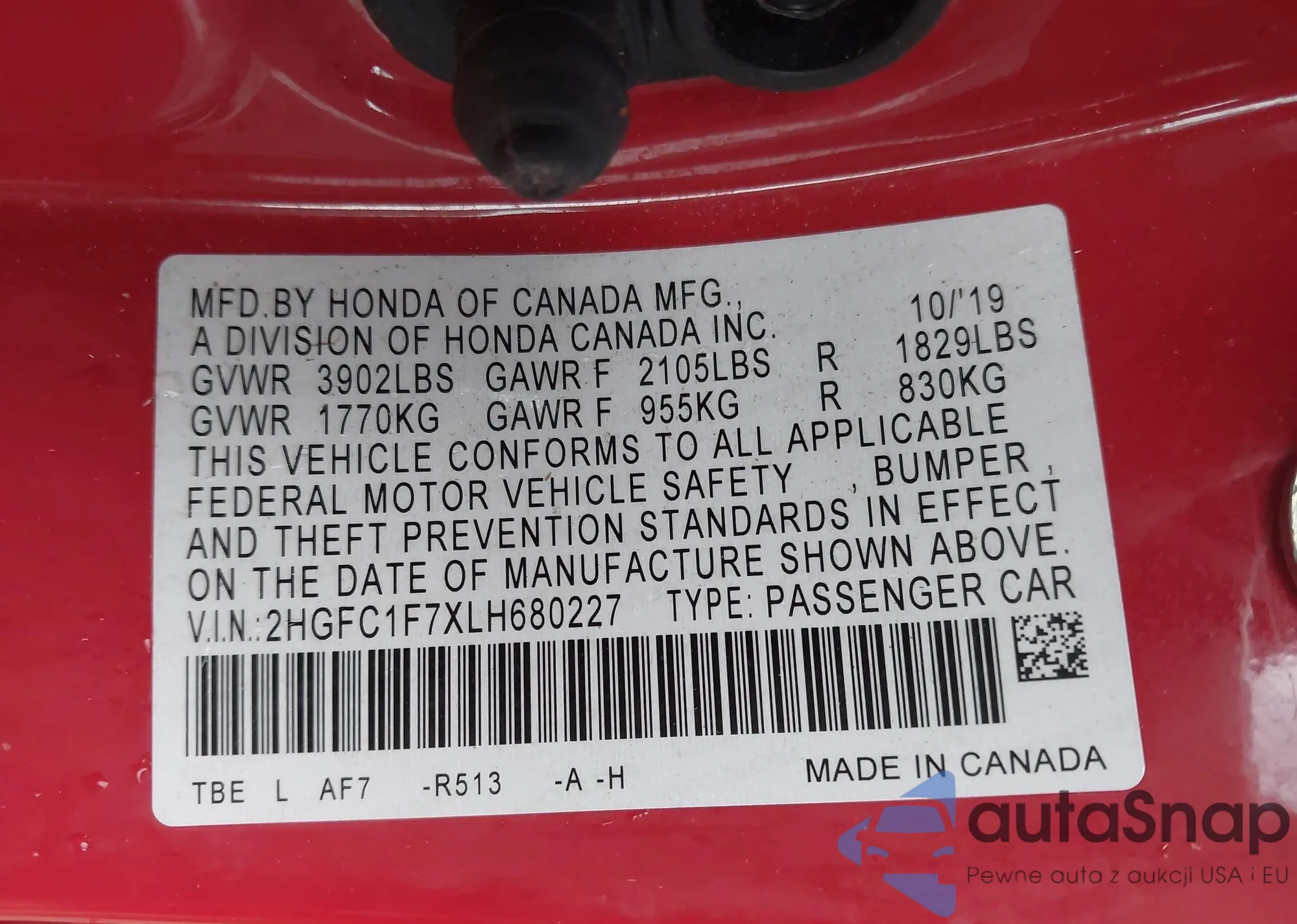 • VIN 2HGFC1F7XLH680227