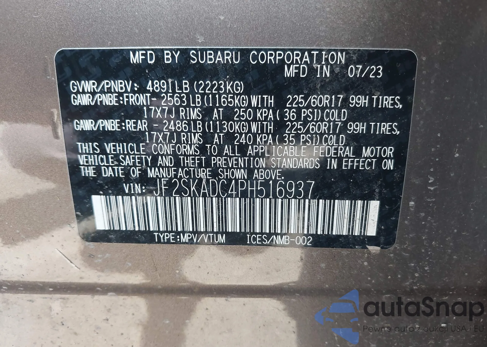 LOT: 41868679 VIN: JF2SKADC4PH516937