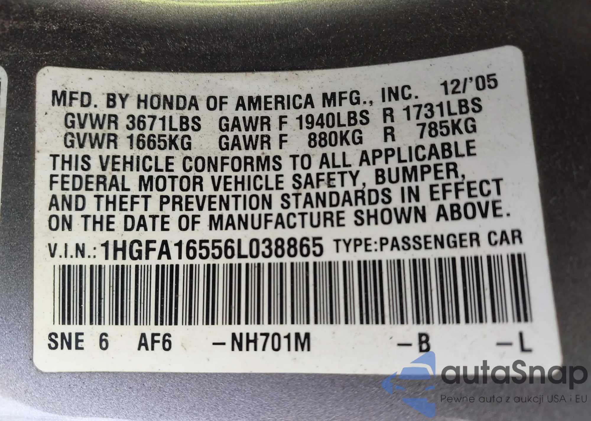 • VIN 19XFL2H87PE002675