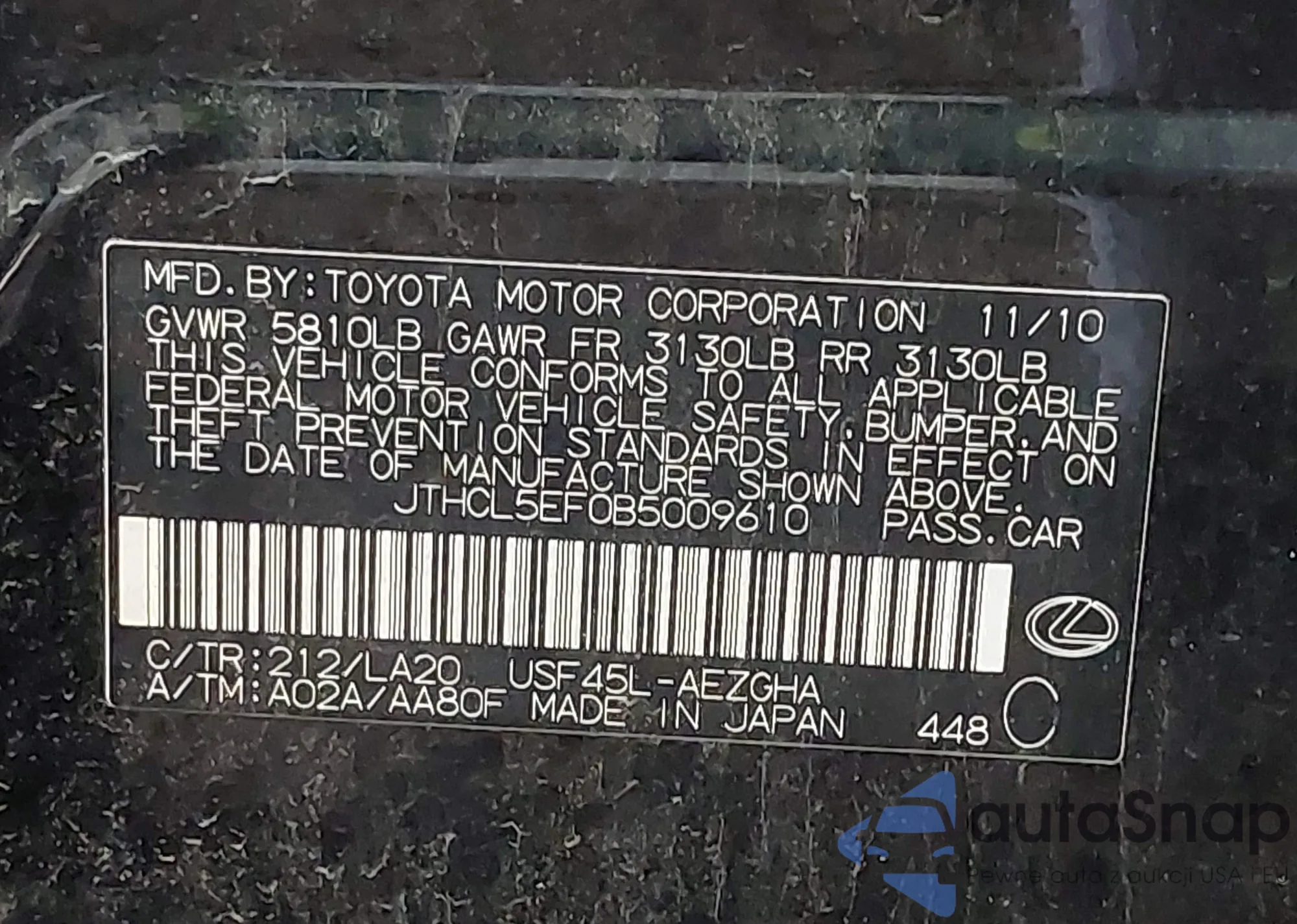 • VIN JTHCL5EF0B5009610
