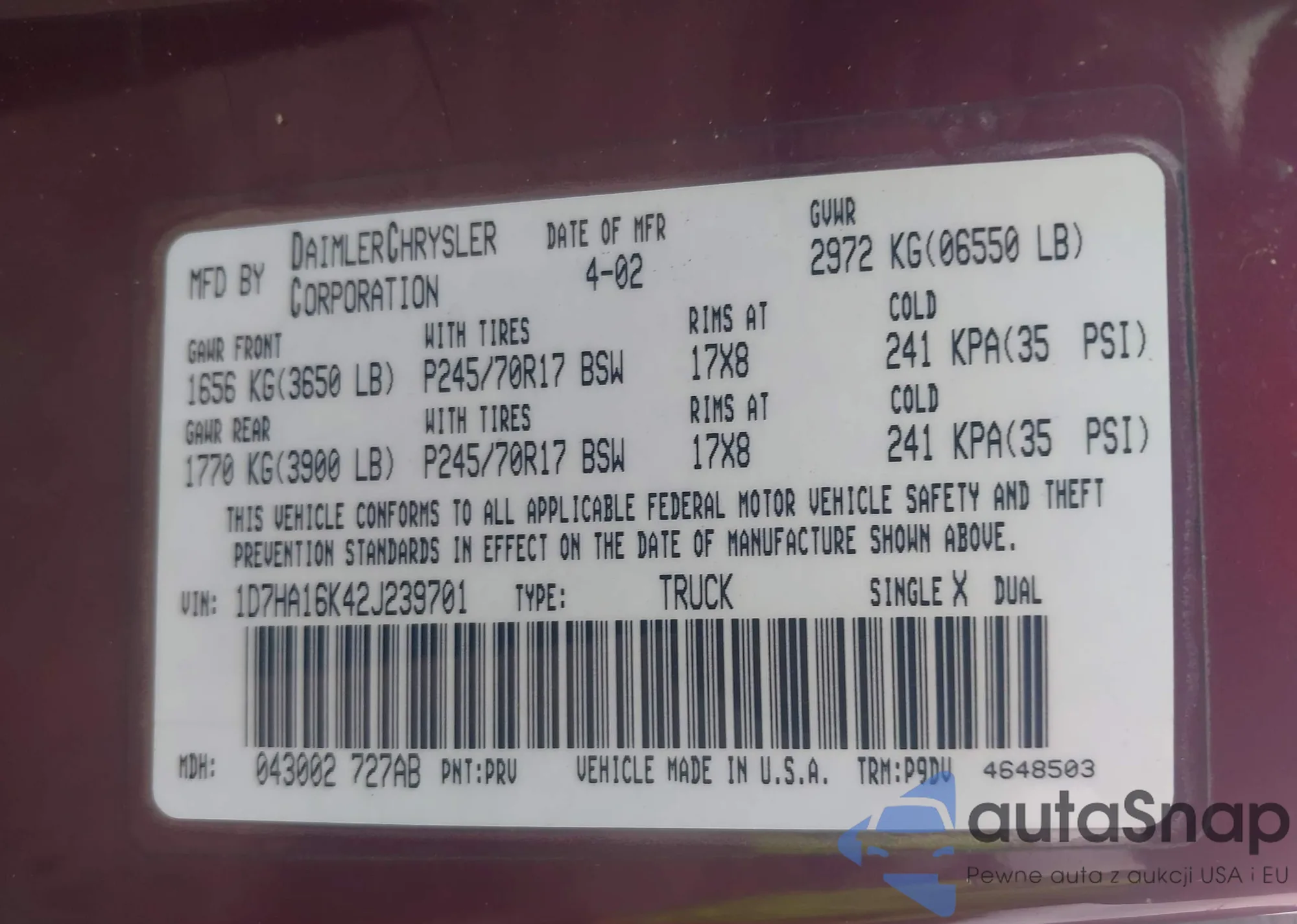LOT: 42471833 VIN: 1D7HA16K42J239701