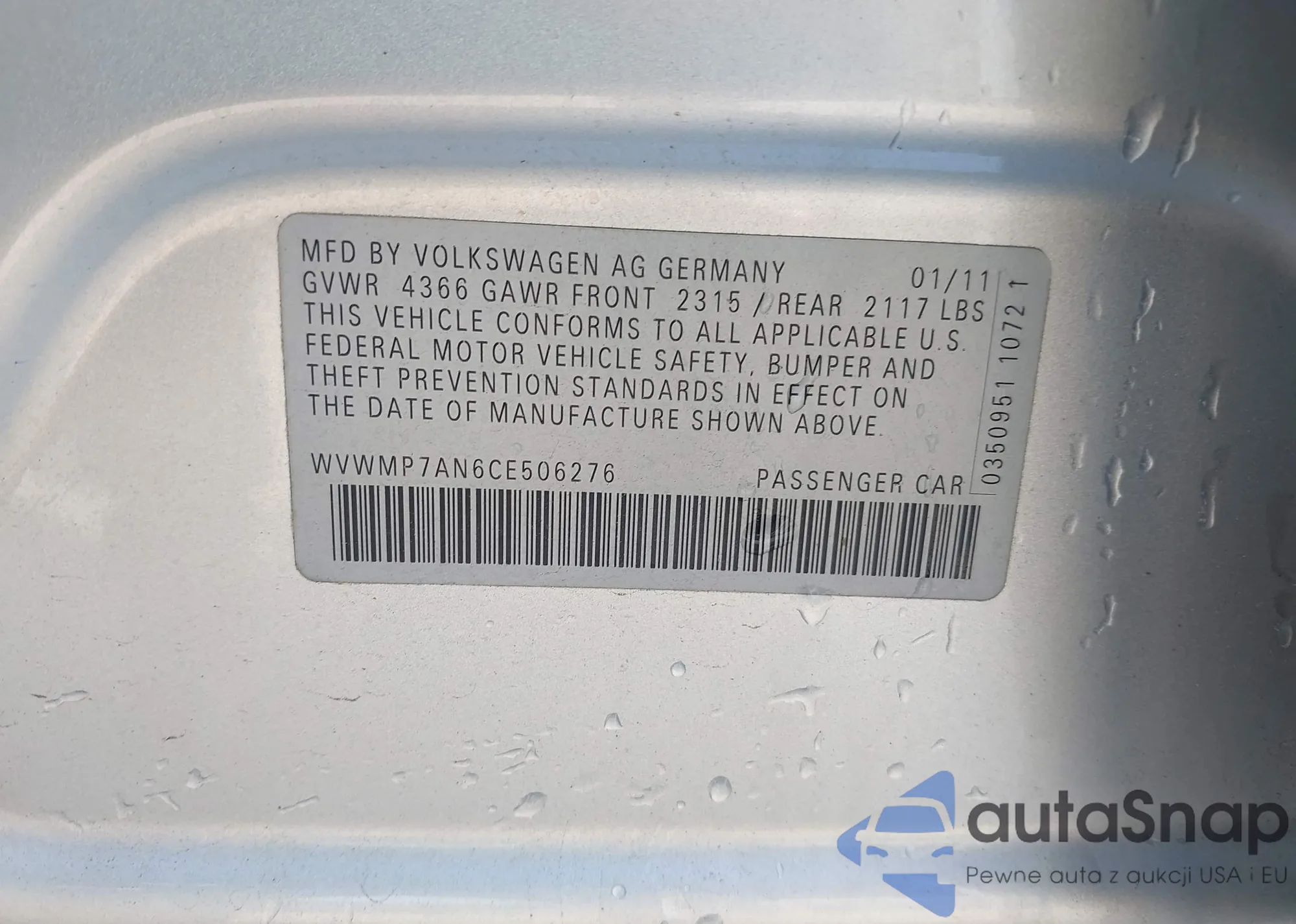 LOT: 42479177 VIN: WVWMP7AN6CE506276