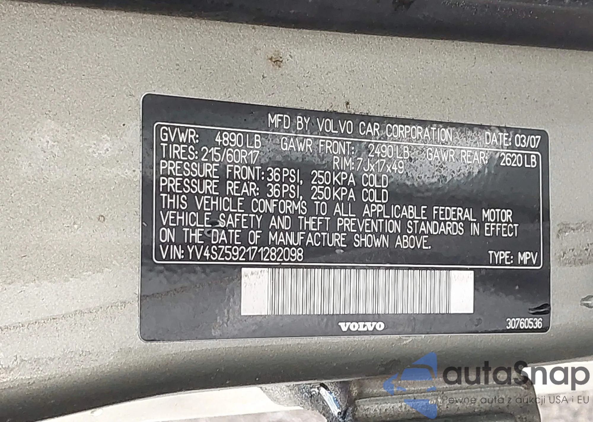 LOT: 42333059 VIN: YV4SZ592171282098