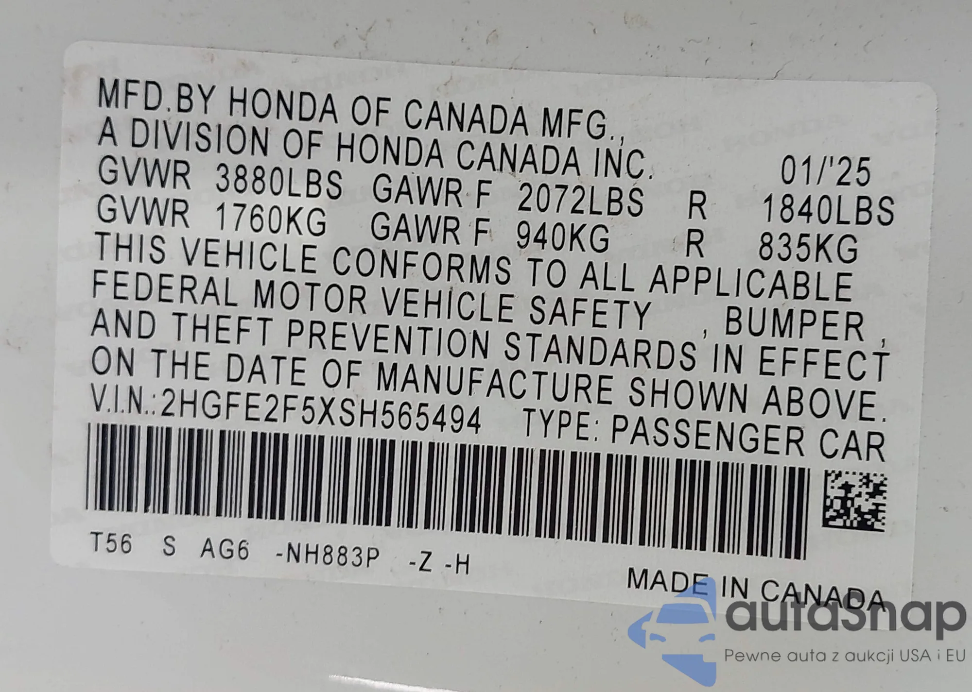 • VIN 2HGFE2F5XSH565494