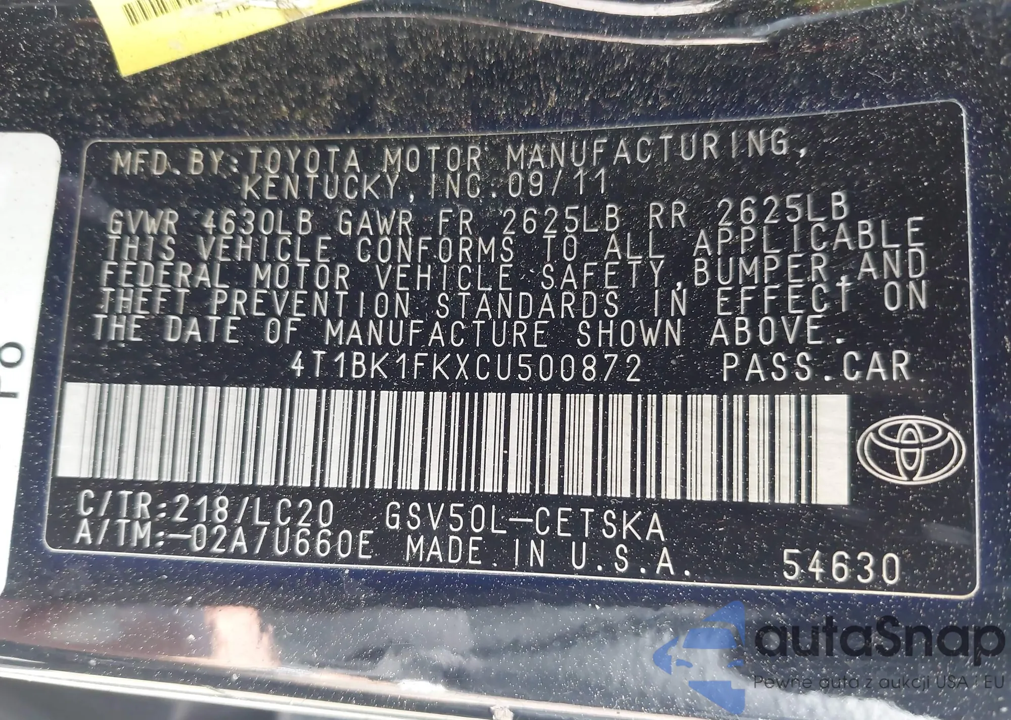 • VIN 4T1BK1FKXCU500872