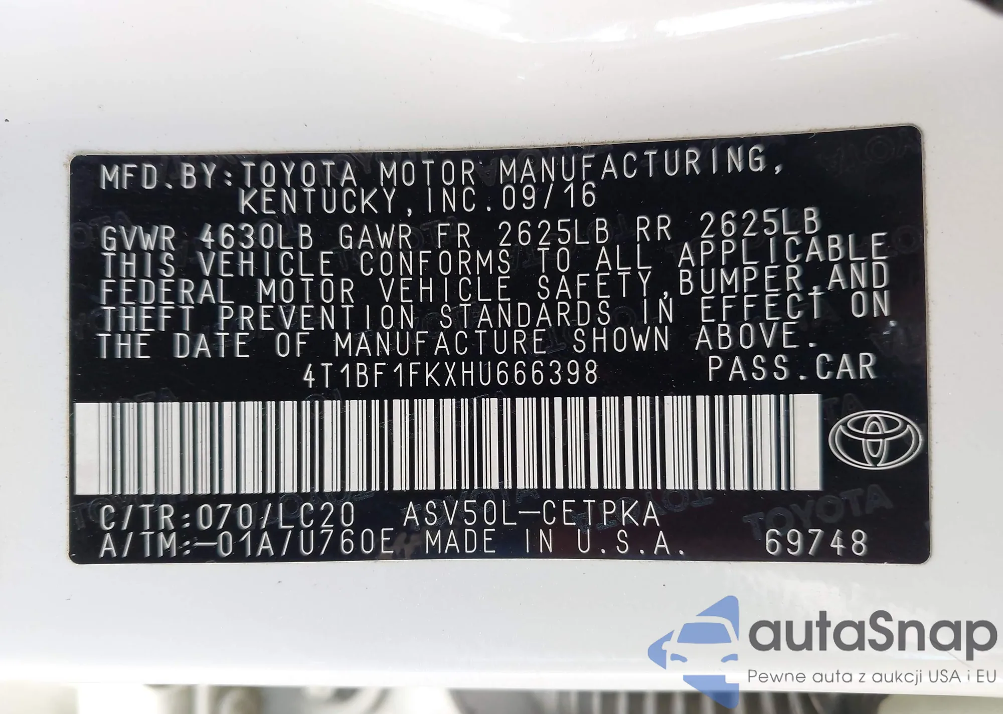 • VIN 4T1BF3EK9BU691748