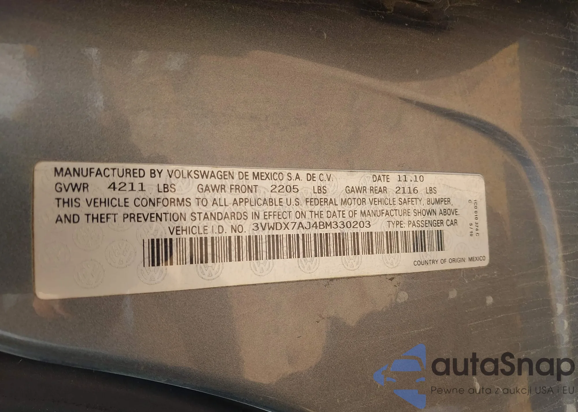 • VIN 3VWDX7AJ4BM330203
