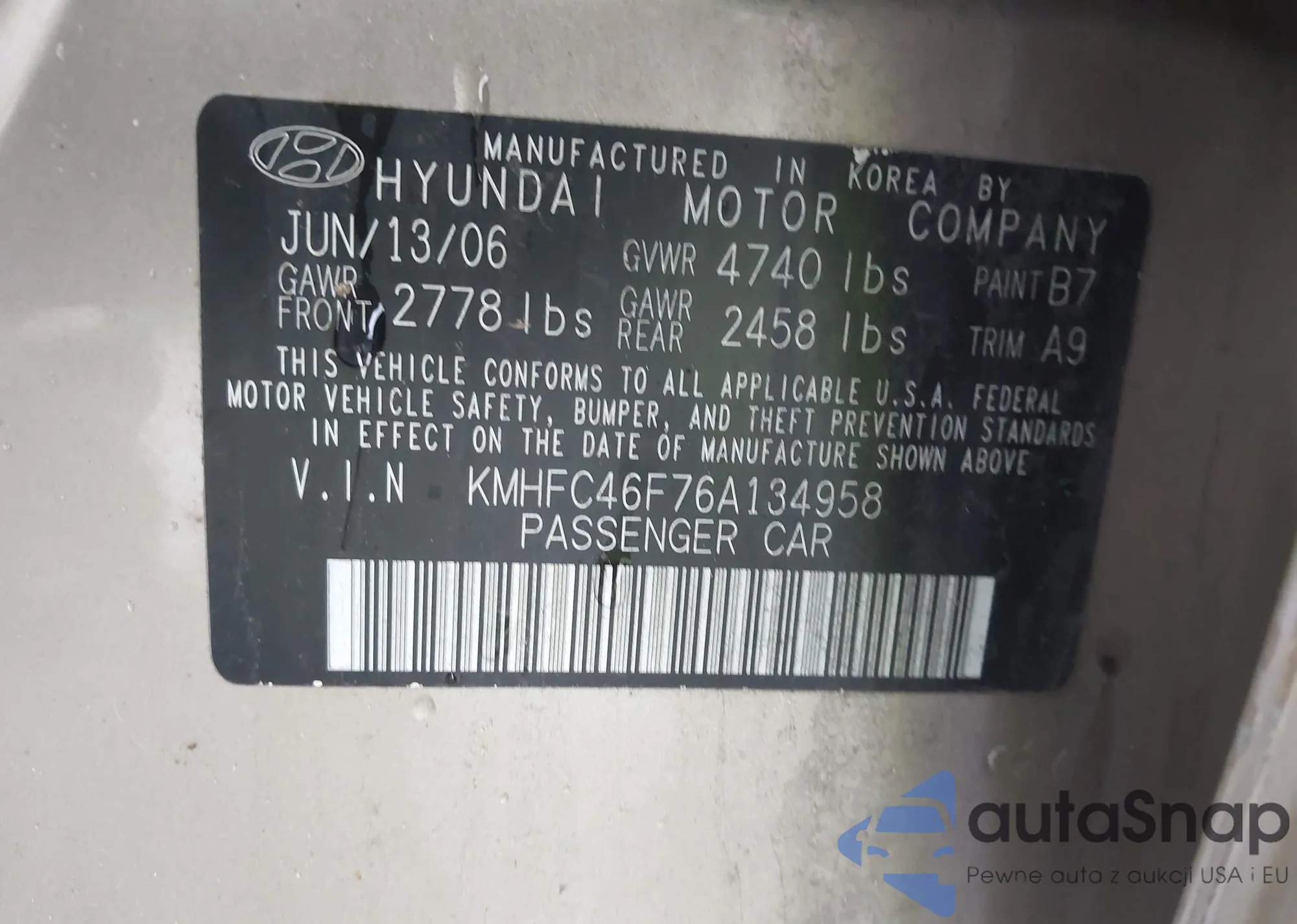 LOT: 42314943 VIN: KMHFC46F76A134958