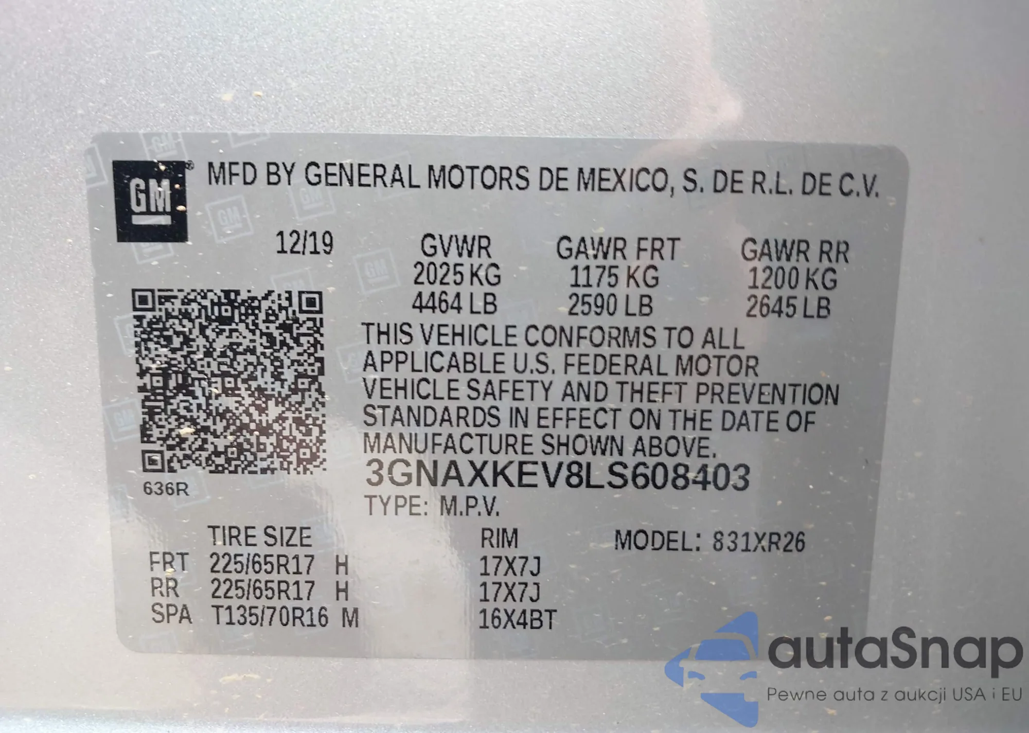 LOT: 42349611 VIN: 3GNAXKEV8LS608403